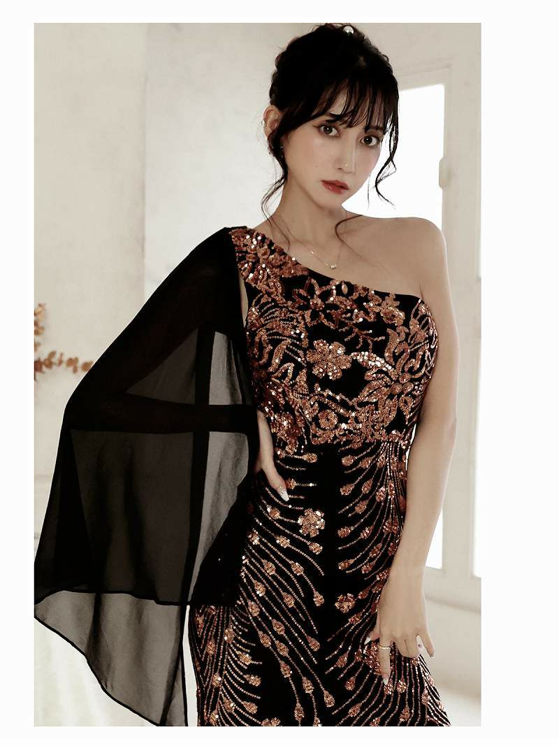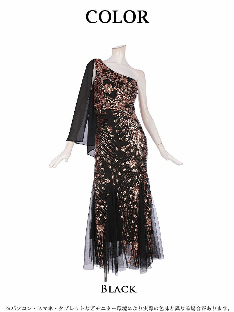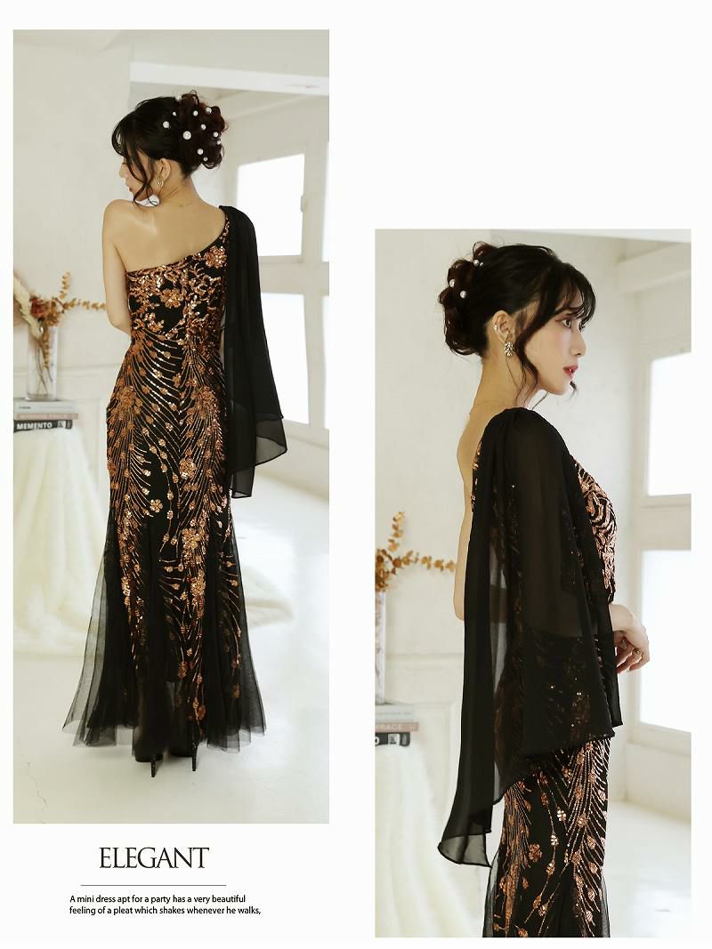 ワンショルダーシフォンスリーブブラックロングドレス 加賀美早紀 着用キャバドレス【Belsia】