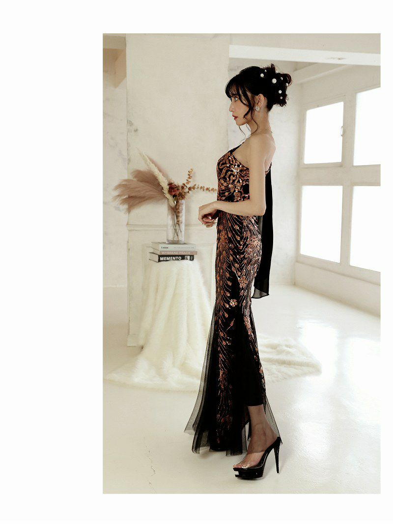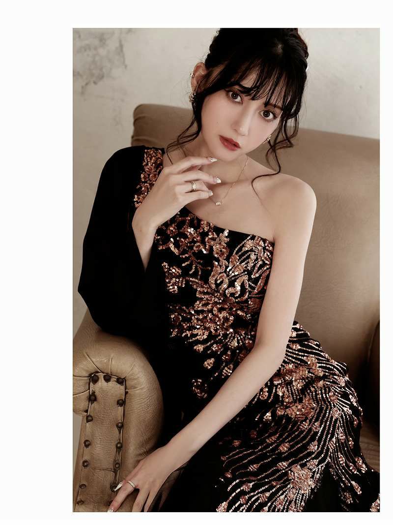 3. ワンショルダーシフォンスリーブブラックロングドレス 加賀美早紀 着用キャバドレス【Belsia】(M/L)(ブラック)