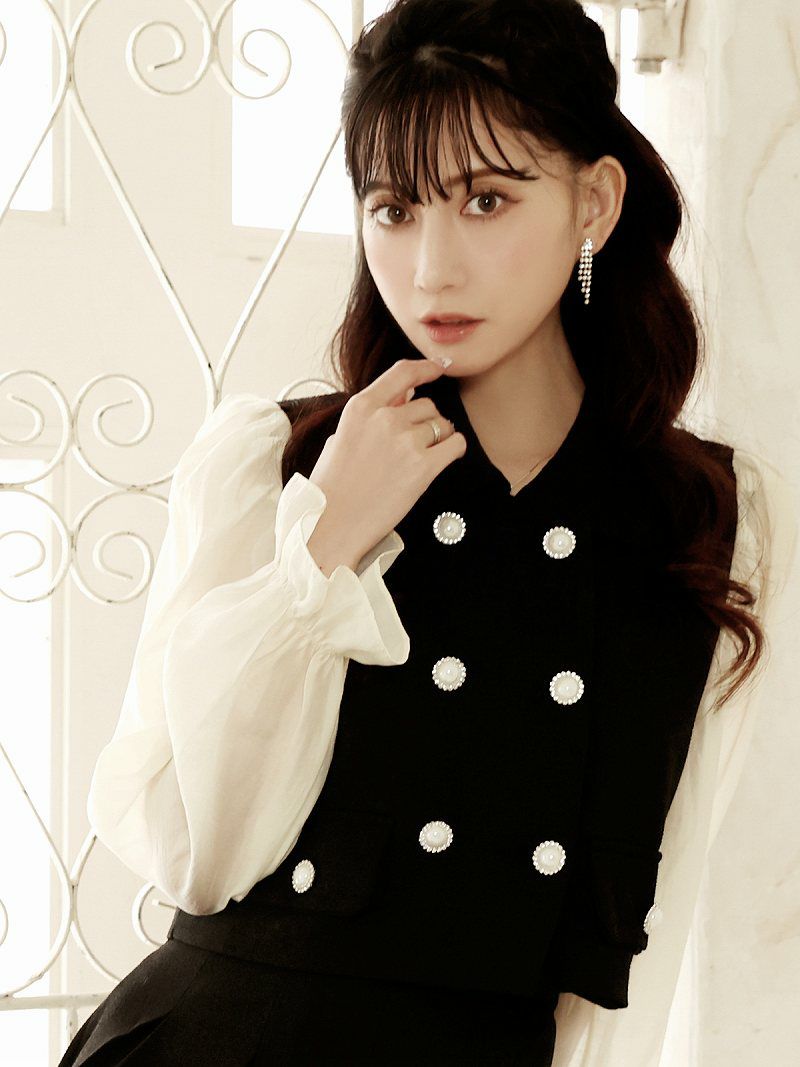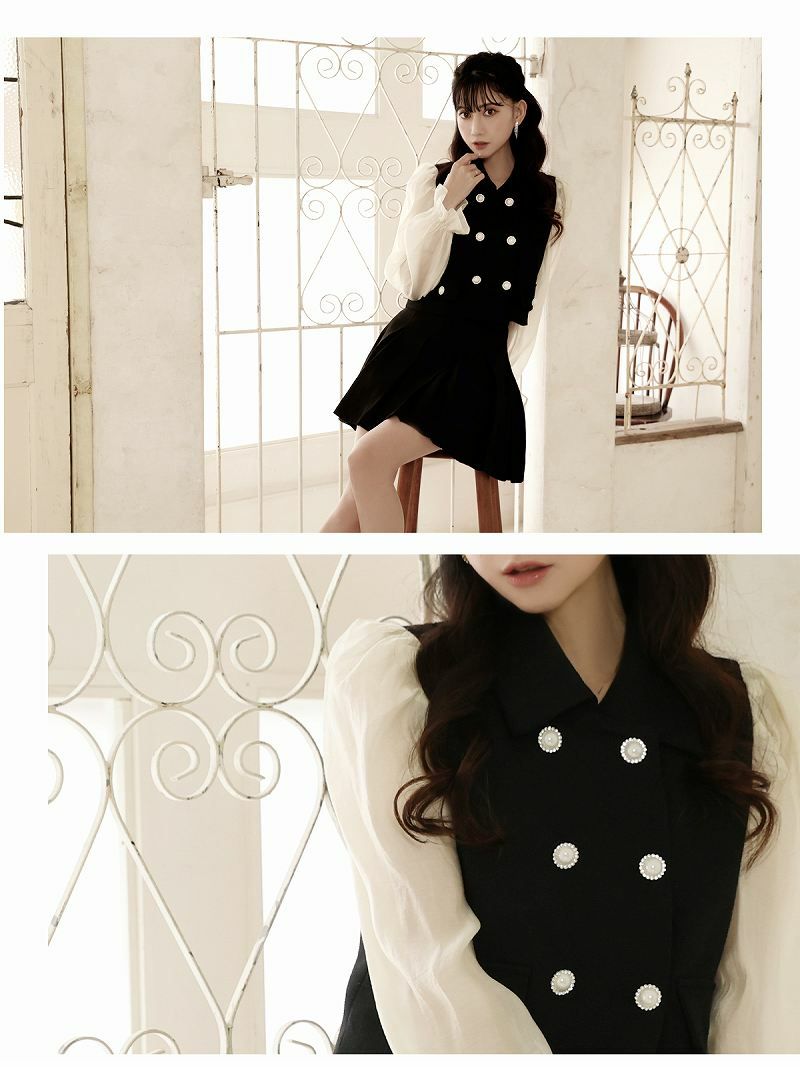 6. レイヤード風シフォン袖ツイードセットアップ 加賀美早紀 着用キャバドレス【Belsia】(M/L)(ブラック)