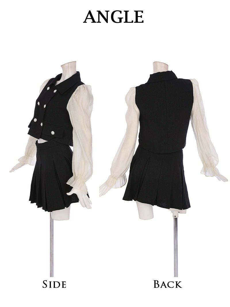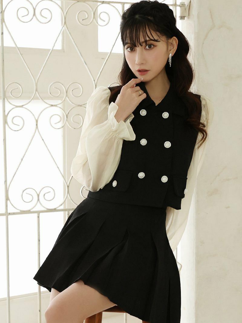 ふんわり袖×プリーツフレアでフェミニンに レイヤード風シフォン袖ツイードセットアップ 加賀美早紀 着用キャバドレス【Belsia】(M/L)(ブラック)