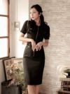 上品なライトツイード素材とノーカラーデザインが大人の魅力を引き立てる韓国タイトワンピース。