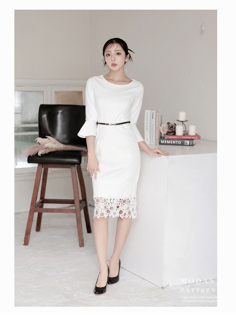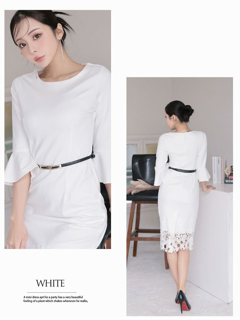 膝丈のミディ丈と裾レースが上品で、同伴やラウンジシーンにもぴったりな韓国ワンピースです。