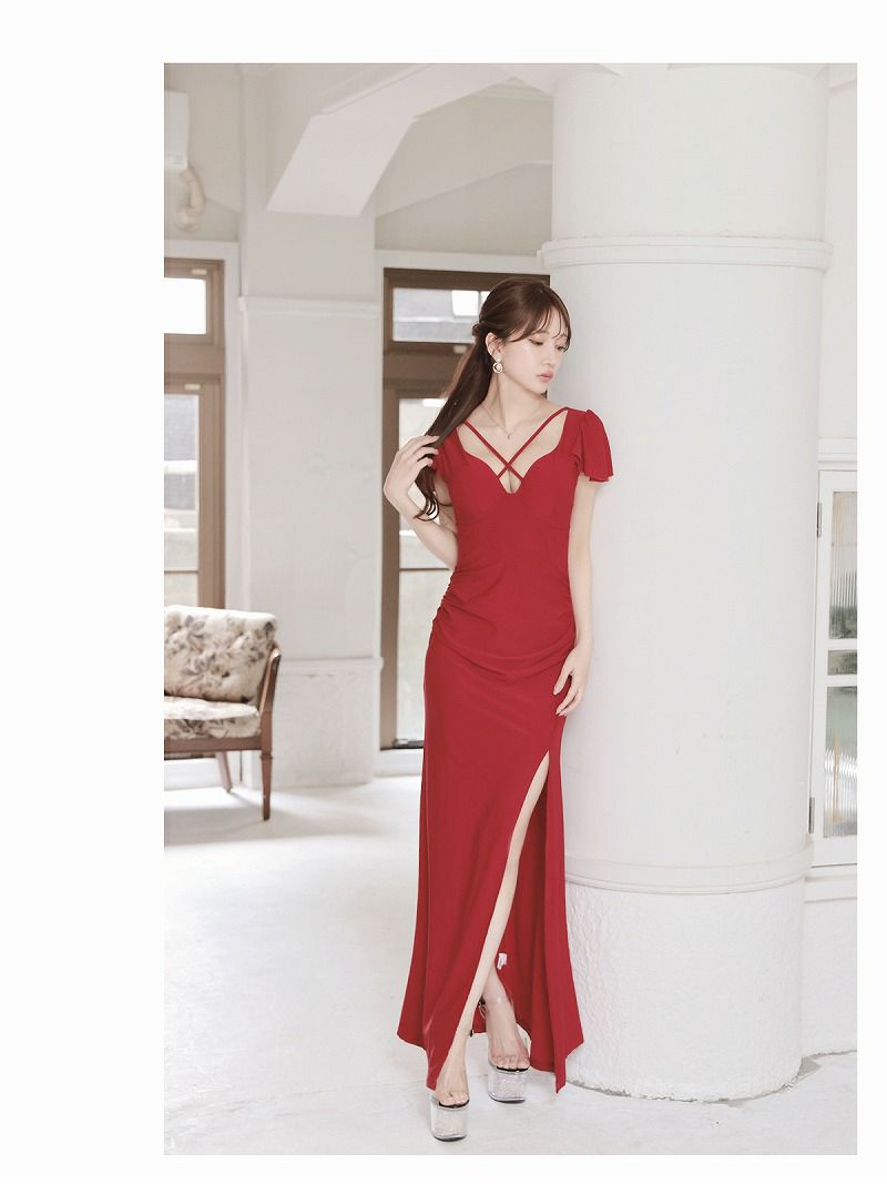 目を惹く大胆な谷間見せが男心をくすぐるロングドレスです。