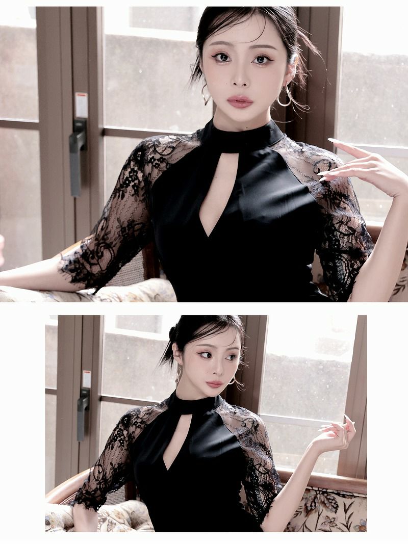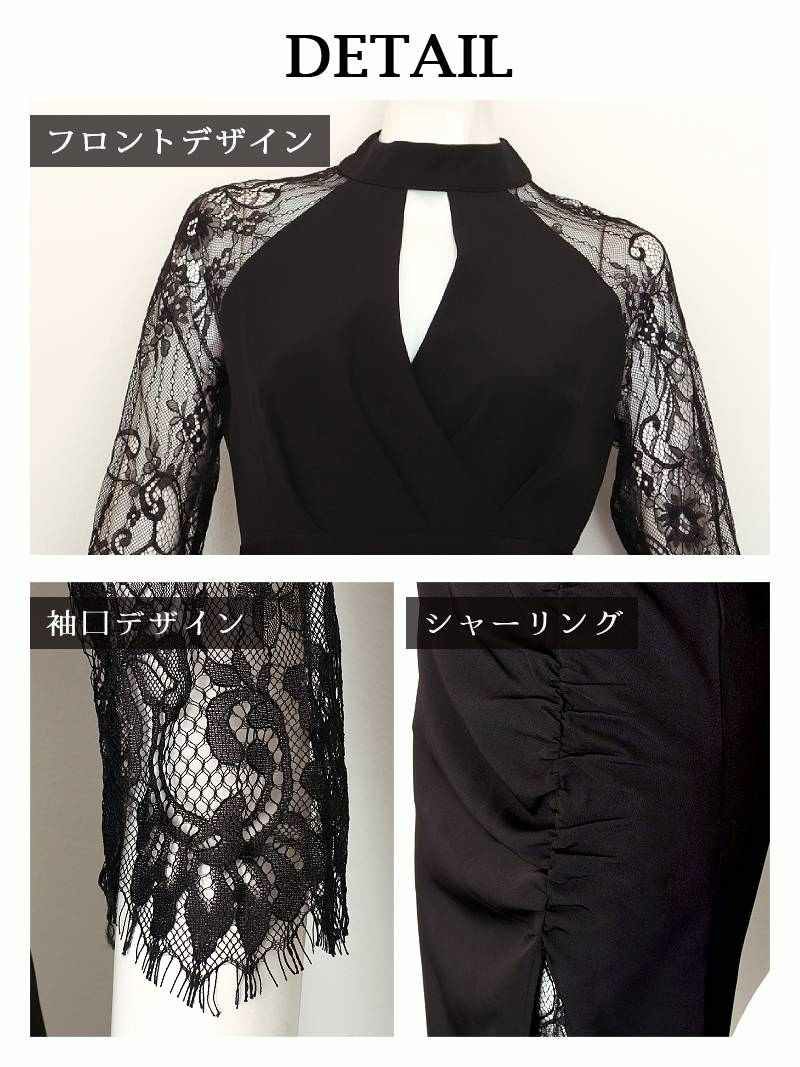 6. 先行予約割¥8980→¥8530!※一部予約販売※スリットレース×ギャザー袖付きアメスリ風韓国ドレス KANO 着用 キャバワンピース【DAYS PIECE】(S/M/L/XL(2L))(ブラック)