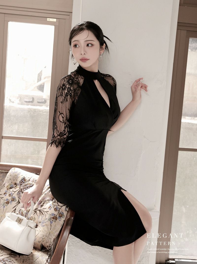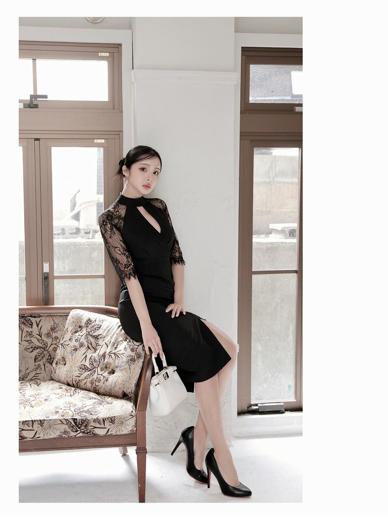 レース×スリットが華やかに映える韓国ドレス風の1着はキャバワンピースやラウンジワンピースとしても着用OK。