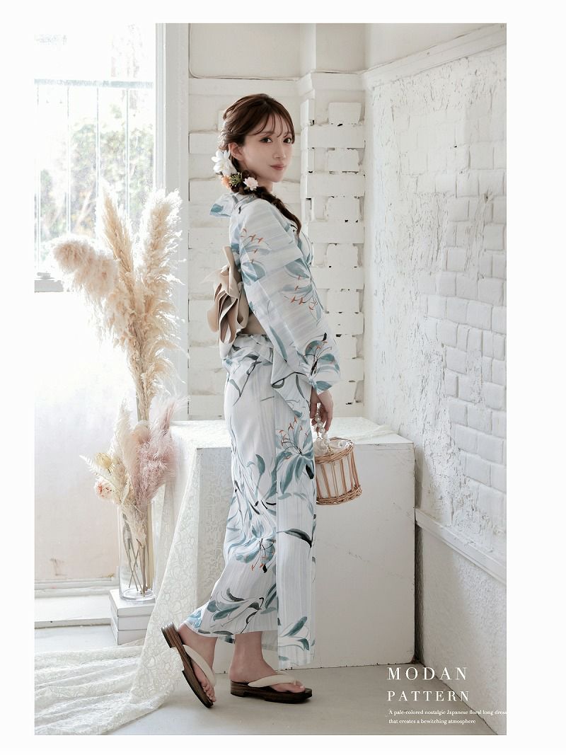 白地に青の百合が映える大判の古典柄が魅力の女性用ゆかたです。