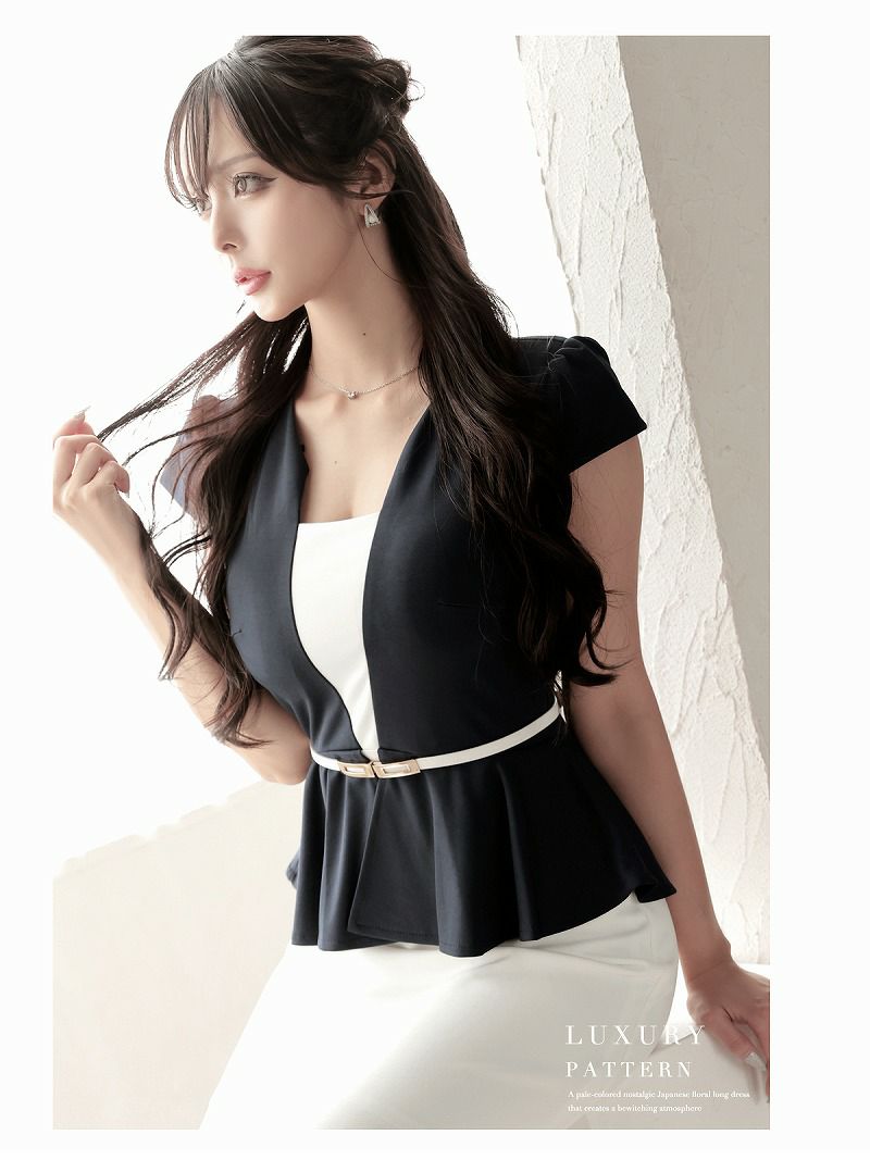 まるでセットアップ風に見えるレイヤード風デザインのキャバワンピースです。