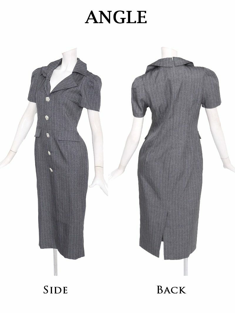 かっこいいのにかわいい、ドレッシーな韓国キャバワンピース。 ストライプタイト襟付き膝丈韓国ワンピース KANO 着用 キャバワンピース【DAYS PIECE】(S/M/L/XL(2L)/XXL(3L))(グレー)