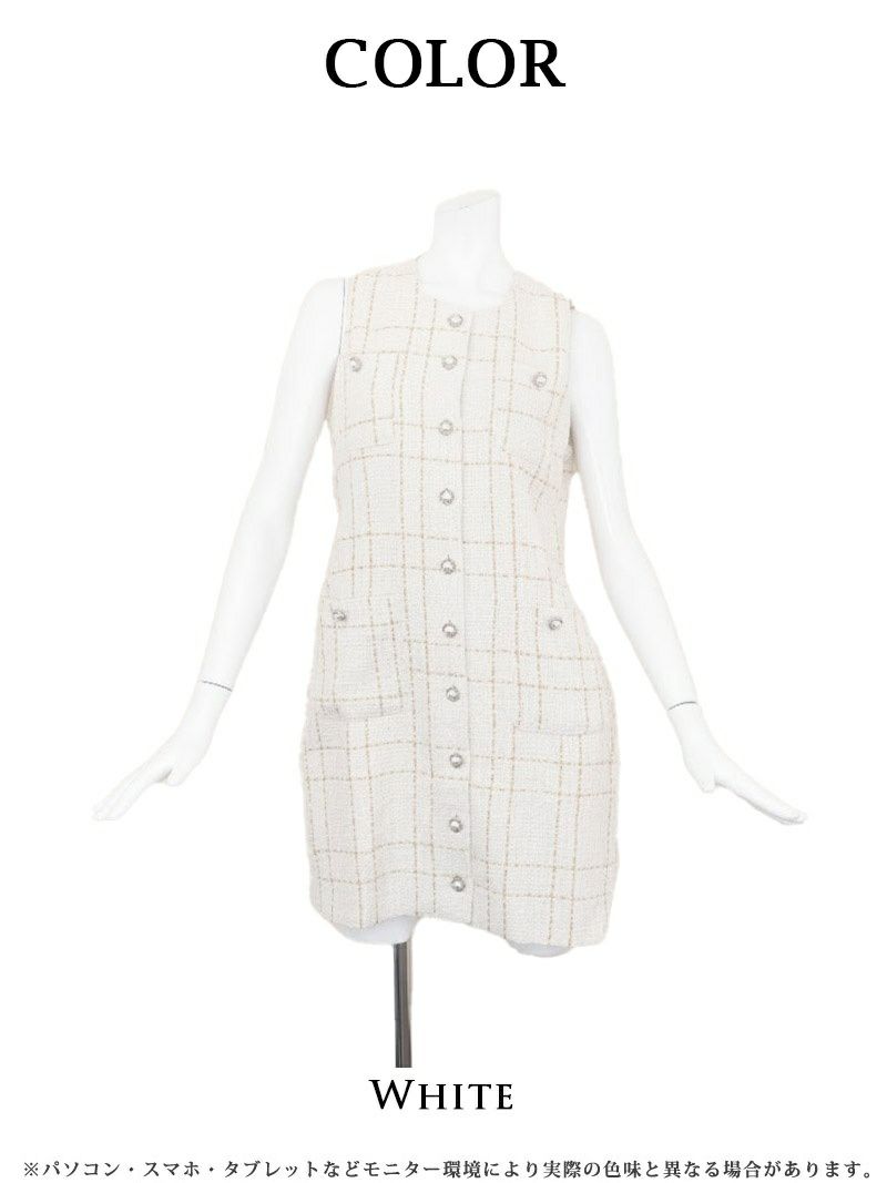 華やかツイードとパールボタン!気品溢れるお嬢様風ノースリーブミニ。 気品溢れるツイード素材!パールボタンが華やかなノースリーブミニワンピース【Ryuyu】(S/M/L/XL(2L)/XXL(3L))(ホワイト)