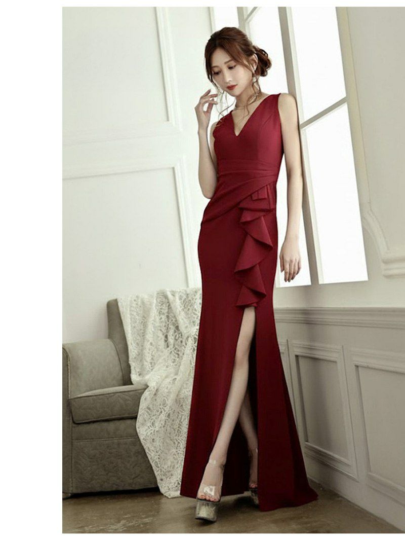 スリットとフリルで魅せる、エレガントな大人のタイトロングドレス。 先行予約割¥10280→¥9765!※一部予約販売※サイドフリルスリット入りタイトロングドレス 加賀美早紀 着用キャバドレス【Belsia】(S/M/L)(ブラック/ホワイト/ワイン)