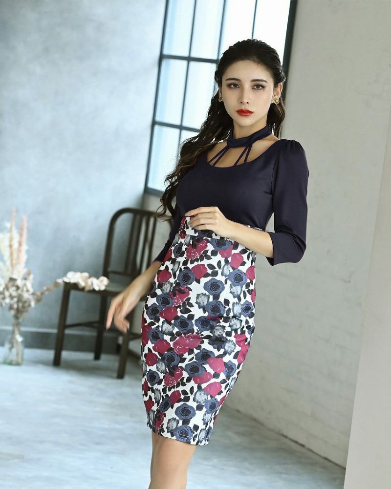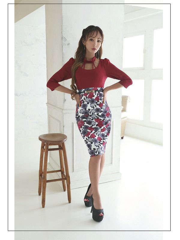 上品な露出なので、同伴など店外のシーンでも活躍 花柄バイカラーハイウエスト 武田静加 着用 袖付きミニドレス【Belsia】(S/M/L)(ネイビー/ワイン)