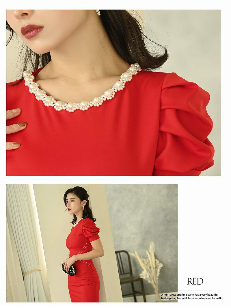 パフスリーブが魅力の膝丈ワンピースは、韓国風デザインで同伴やパーティーにぴったり!