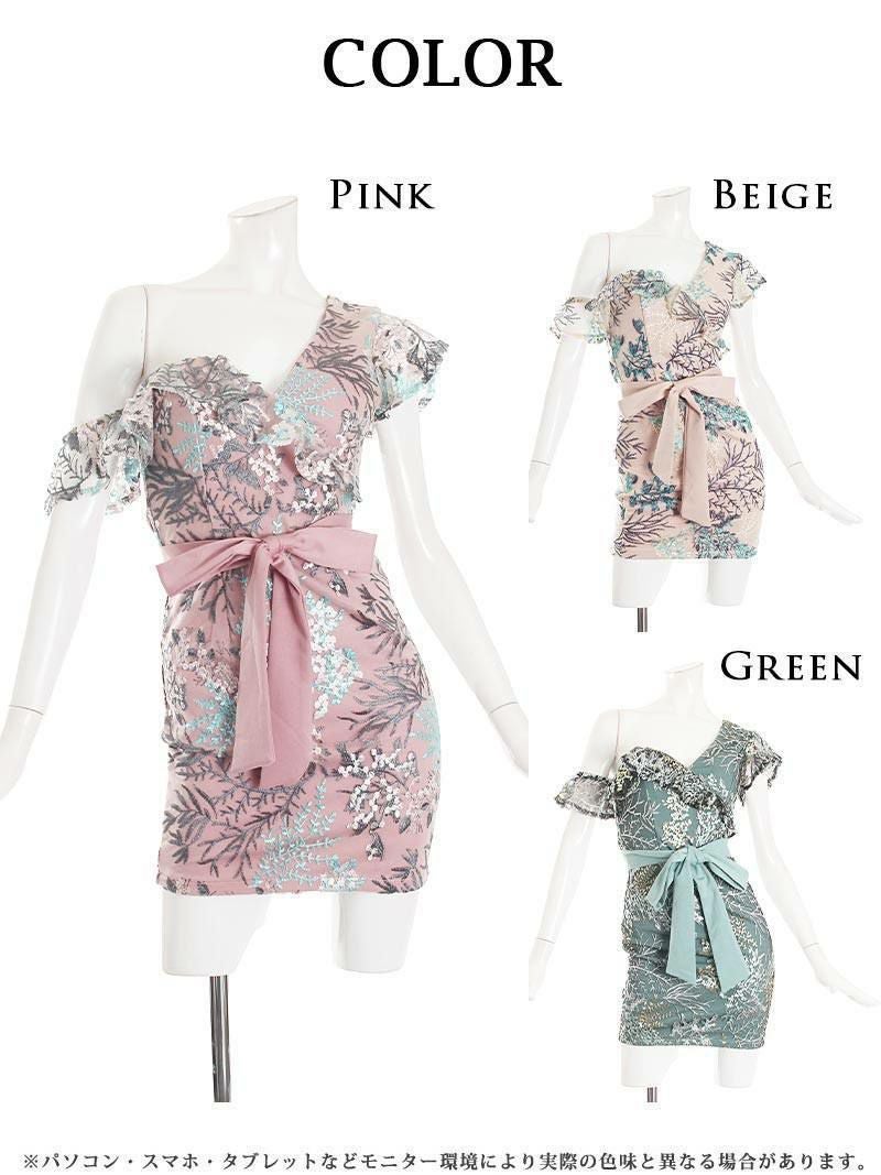 6. ピンク×花柄刺繍フリルワンショルタイトドレス【Belsia】(S/M/L)(ピンク/ベージュ/グリーン)