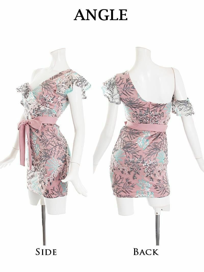 上品な花柄刺繍レースが華やかさを演出する、ピンクのワンショルダーミニドレス。