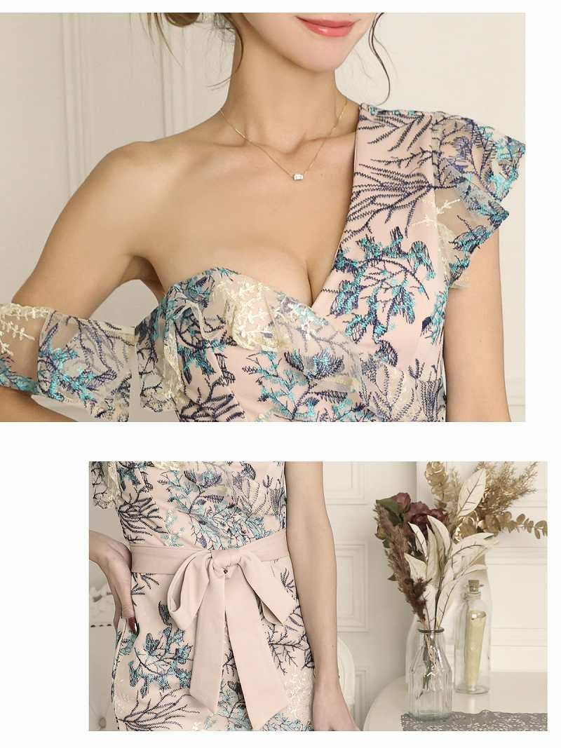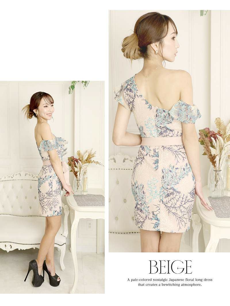ペールカラーの刺繍をキャバドレス全体にあしらったダスティーカラーのミニドレス
