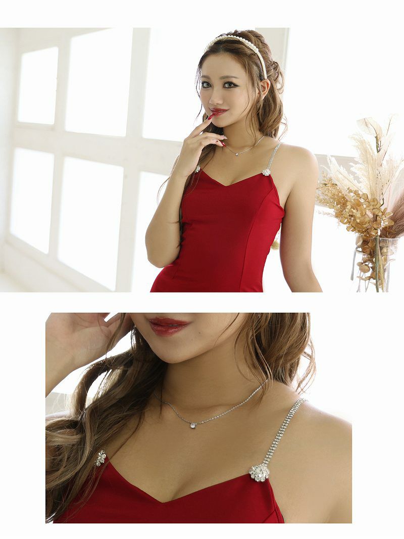 4. キャミソールビジューワンカラーロングドレス りおん 着用 キャバドレス【RyuyuChick】(S/M/L)(レッド)
