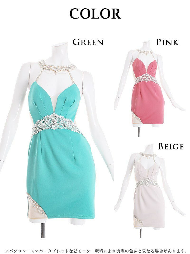 派手でゴージャスな高級ドレス バックシースルービジュータイトキャバミニドレス【Angel R/エンジェルアール】(S/M)(ベージュ/ピンク/グリーン)