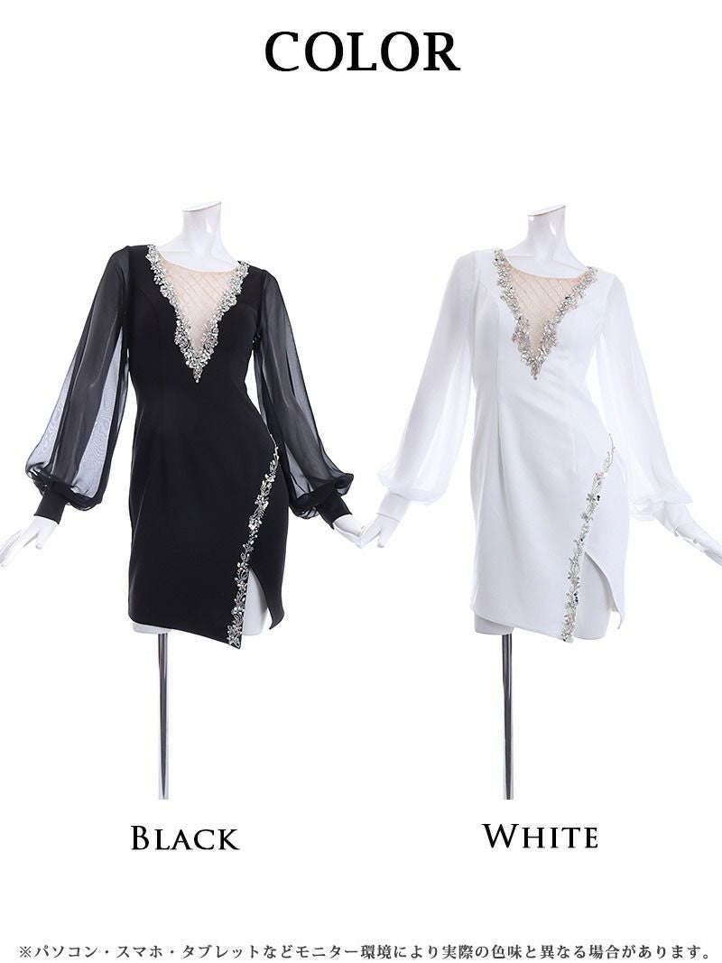 谷間魅せ×長袖で色気と上品さどっちも叶うミニドレス。 胸元のビジューがきらめいて顔周りもパッと明るく演出! 二の腕をさりげなく隠せるシアー袖がマジで神な体型カバードレス。 スリットのビジューがチラ見せでヌケ感ちょうどいい! 初心者さんも挑戦しやすい高級キャバドレス。