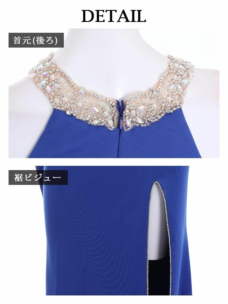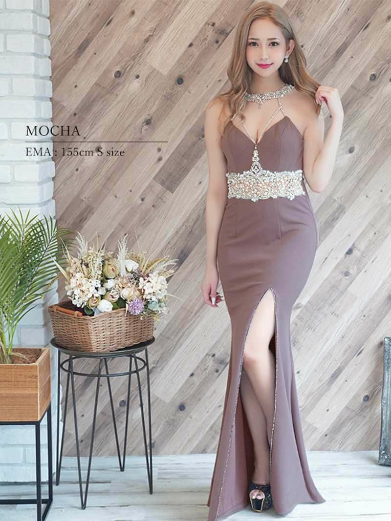 ビジューはウエストだけではなく、デコルテ・首元にもON。ホルターネックデザインだから綺麗にバストも盛ってくれるキャバドレスです。