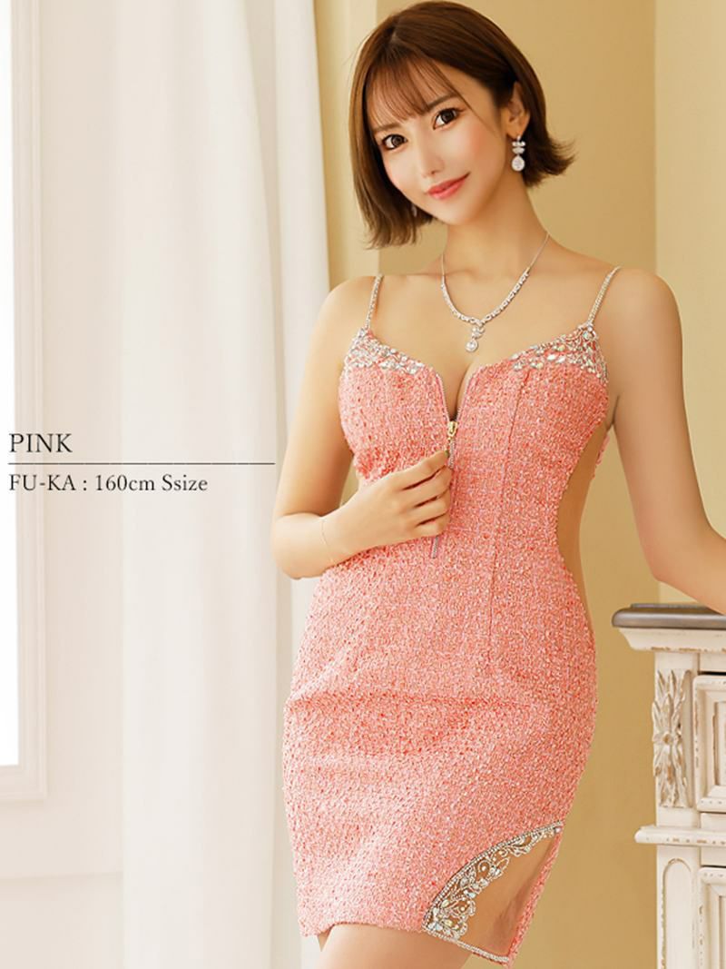 目を惹くジップデザインで周りを誘惑 【Angel R/エンジェルアール】ツイードフロントジップキャミソールタイトキャバドレス(S/M)(ピンク/ホワイト/ブラック)