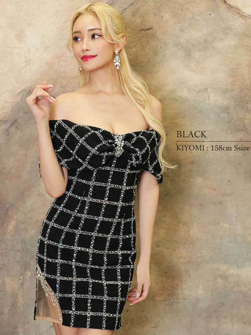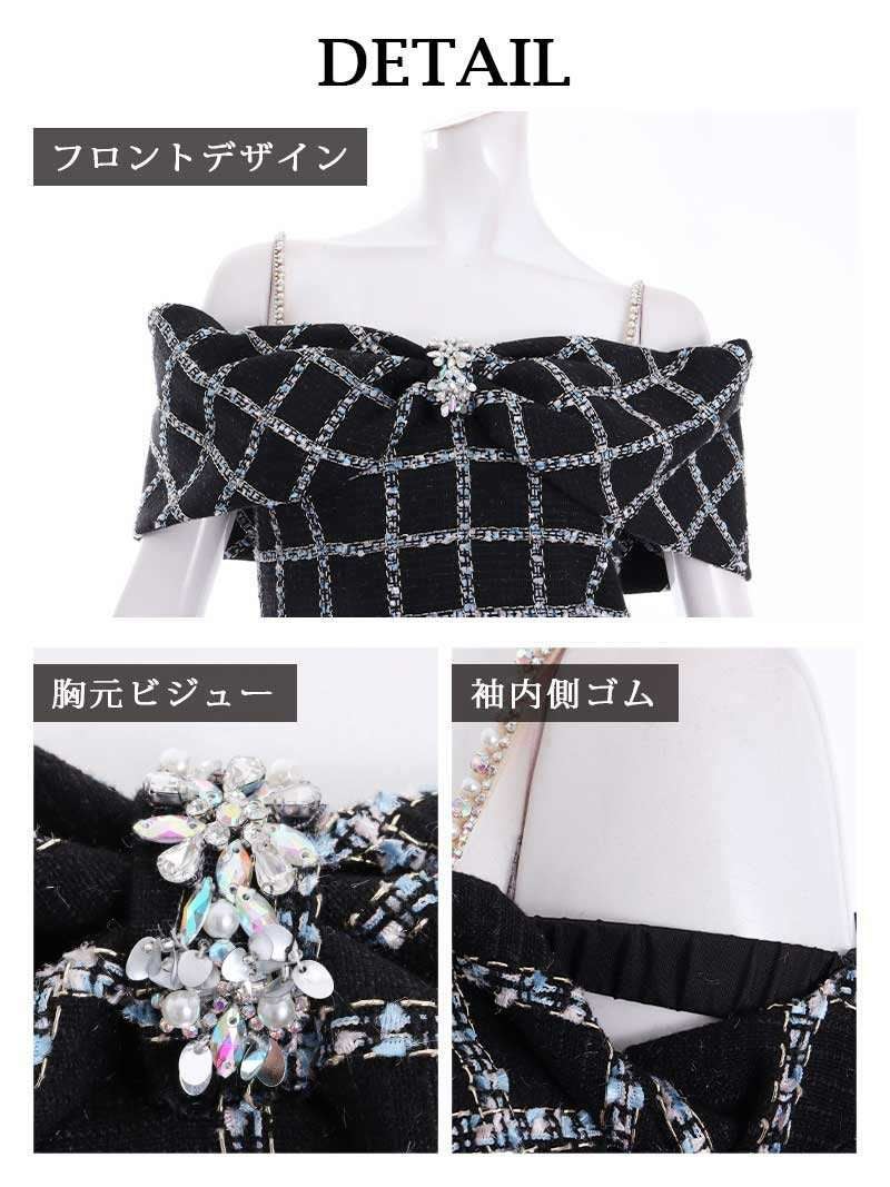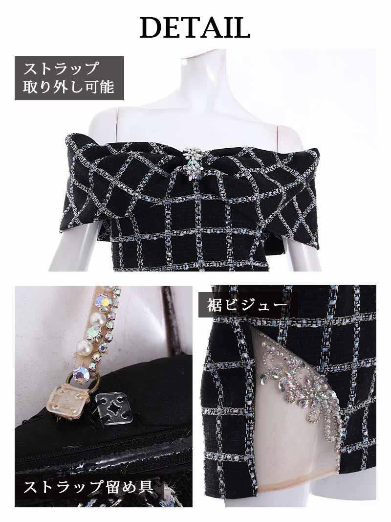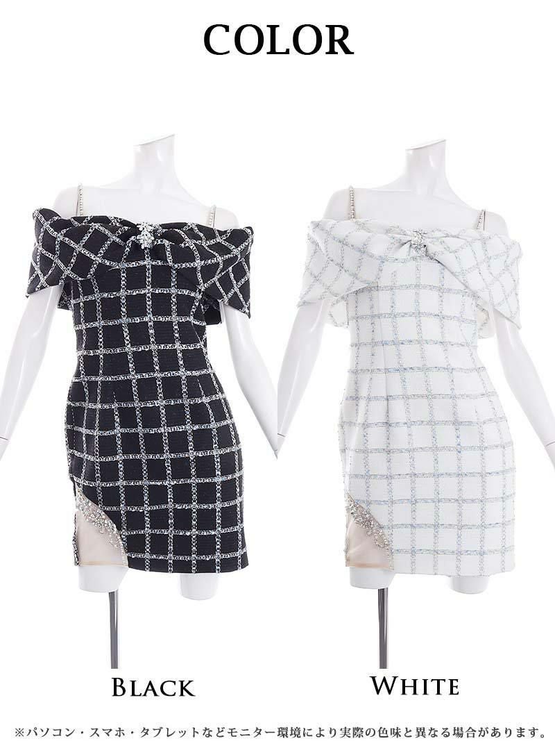 4. リボンモチーフオフショルツイードタイトキャバミニドレス【Angel R/エンジェルアール】(S/M)(ブラック/ホワイト)
