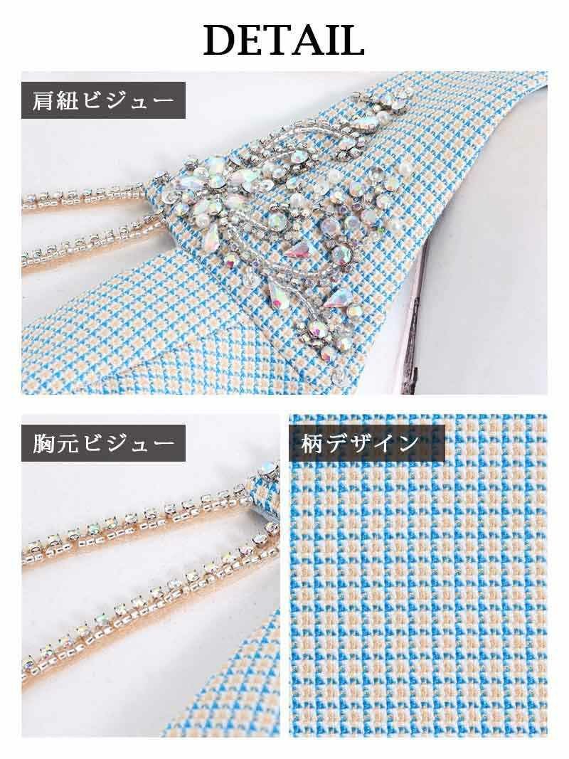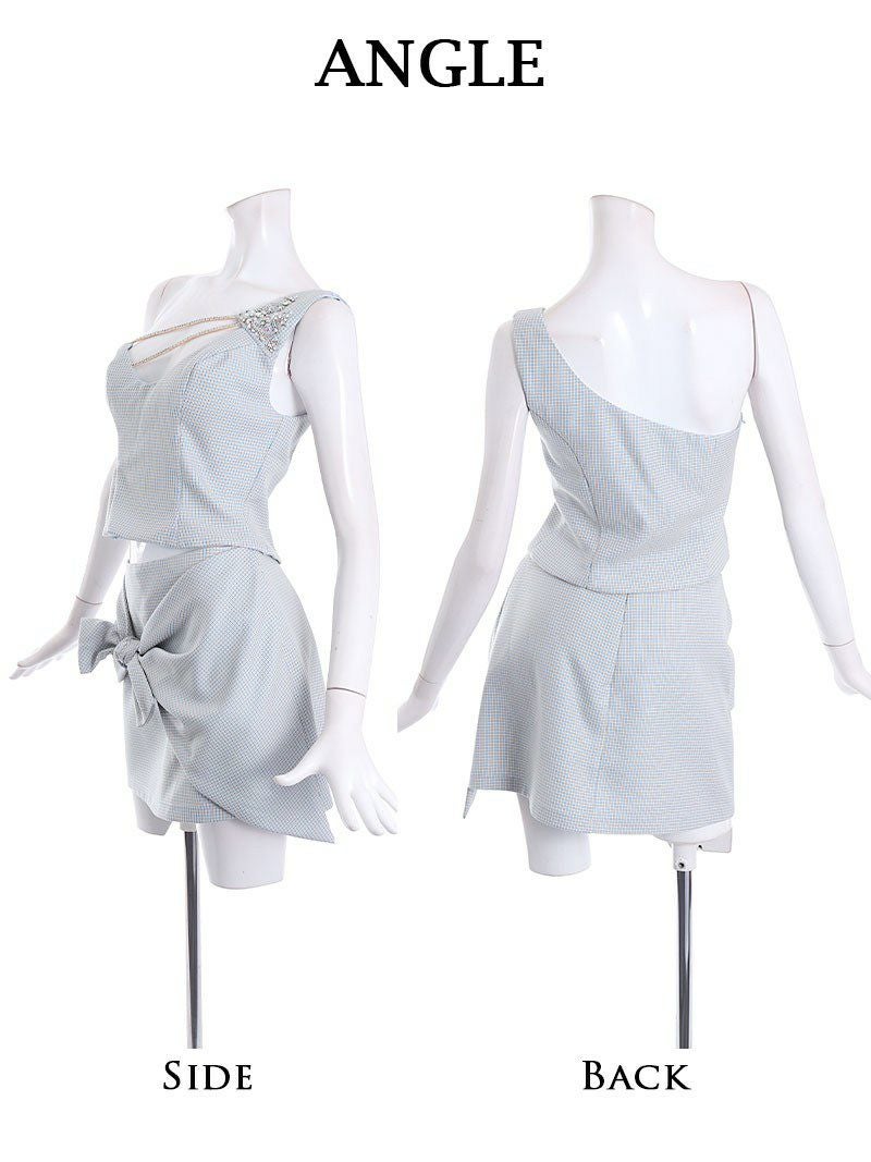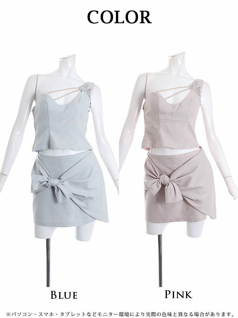 ミニ丈スカートからの足魅せとさりげなく覗く素肌がお客様の目を惹くセットアップドレスは甘めなデザインが好きなキャバ嬢さんにぴったりなキャバクラドレスです。