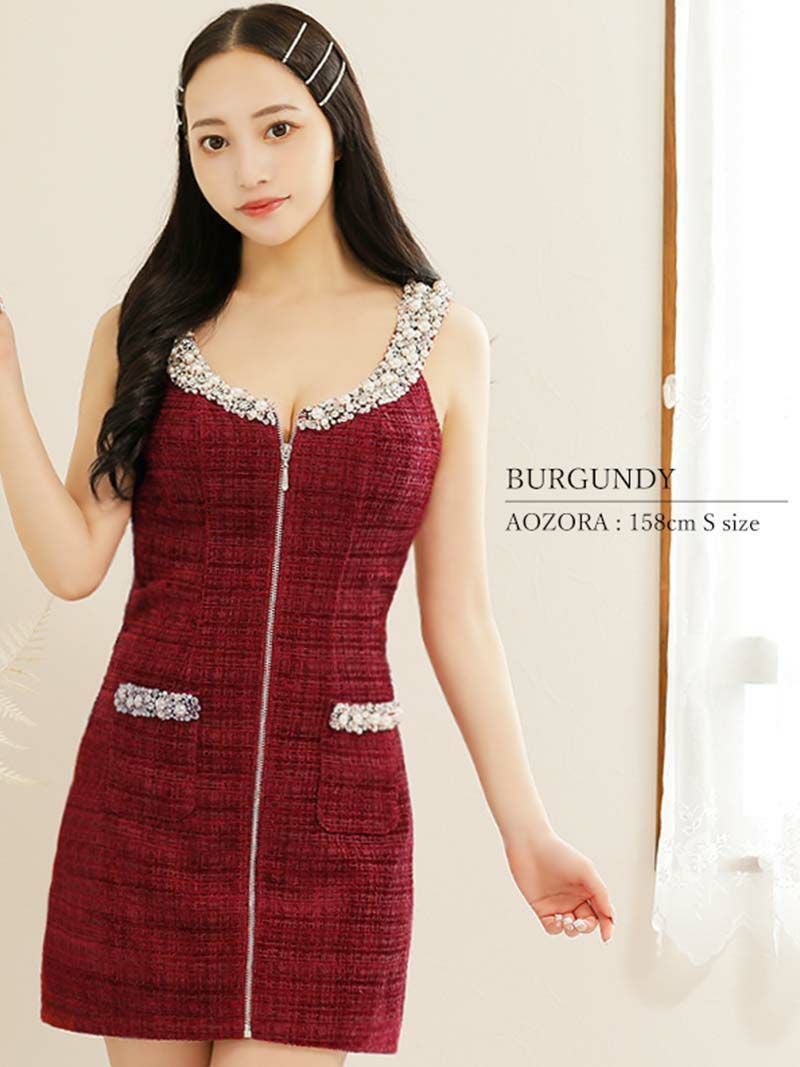 上品なツイード素材に輝くビジューをあしらった華やかデザイン。