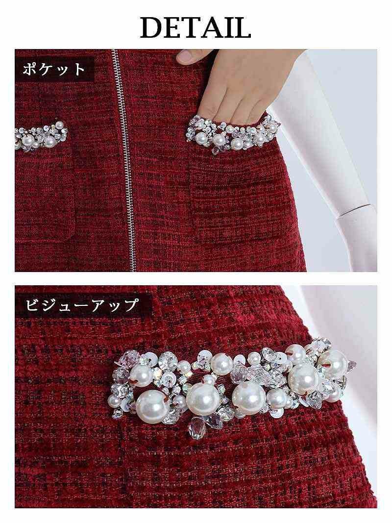 ツイード素材にゴージャスなビジュー装飾が映える、華やかなミニドレス。