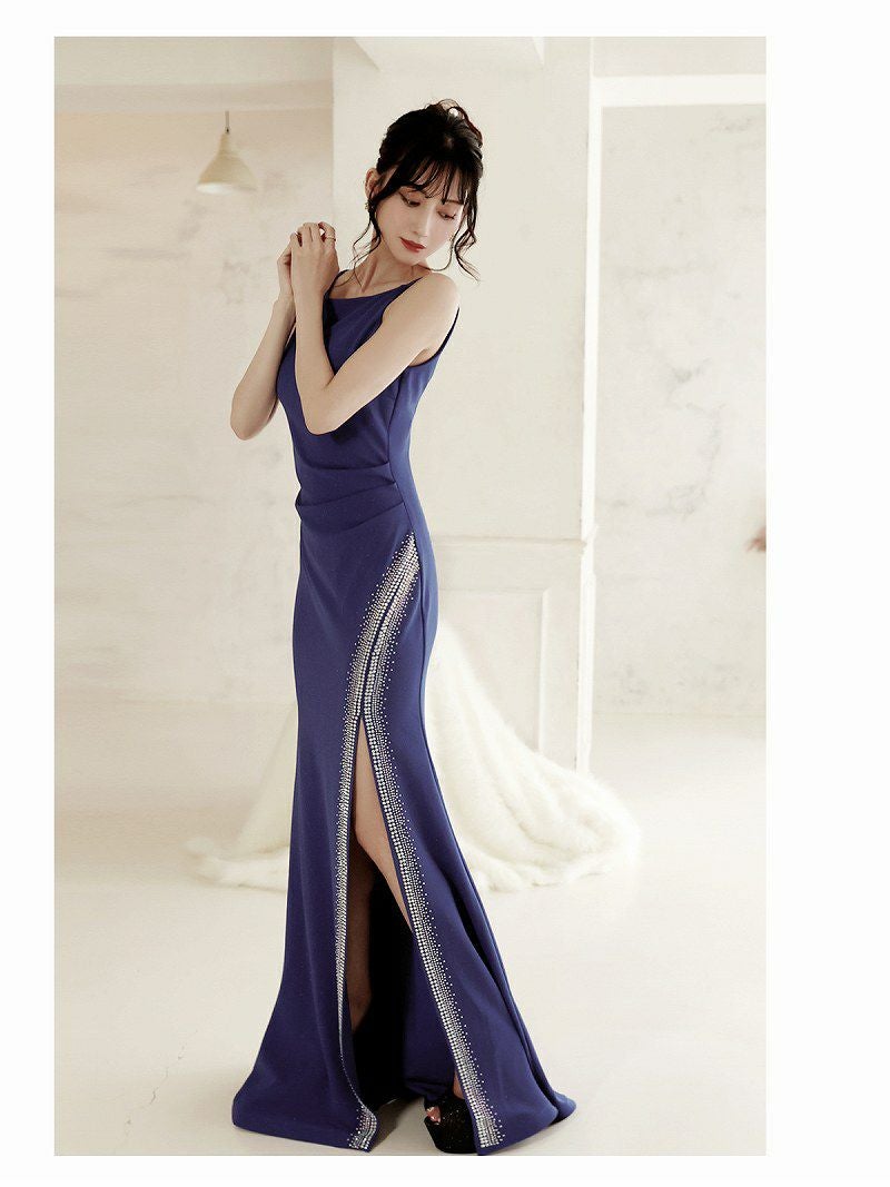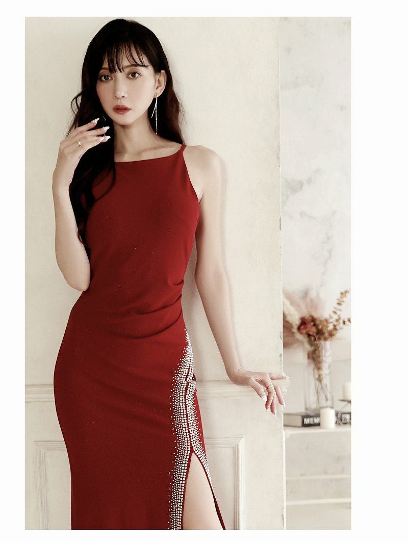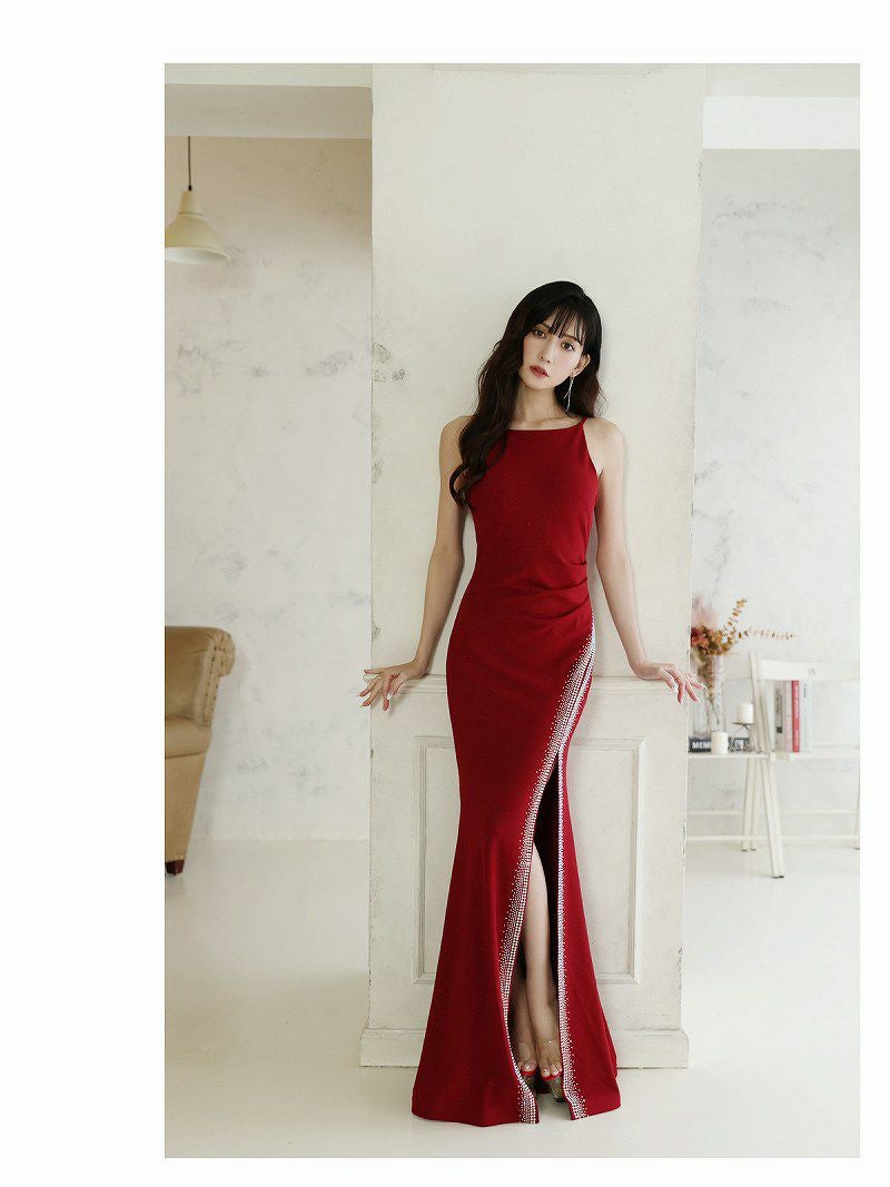 マーメイドラインで美ボディ強調 煌きオーロラビジュースリットロングドレス 加賀美早紀 着用キャバドレス【Belsia】(S/M/L)(レッド/ブラック/ブルー) ptpl