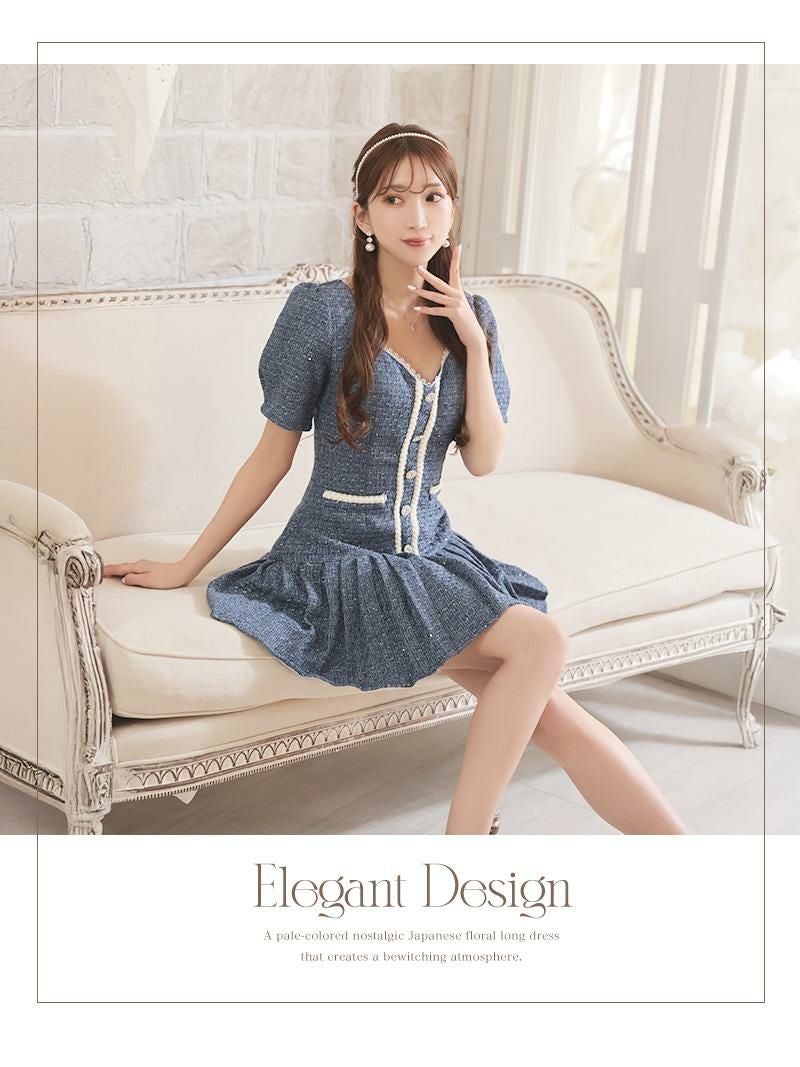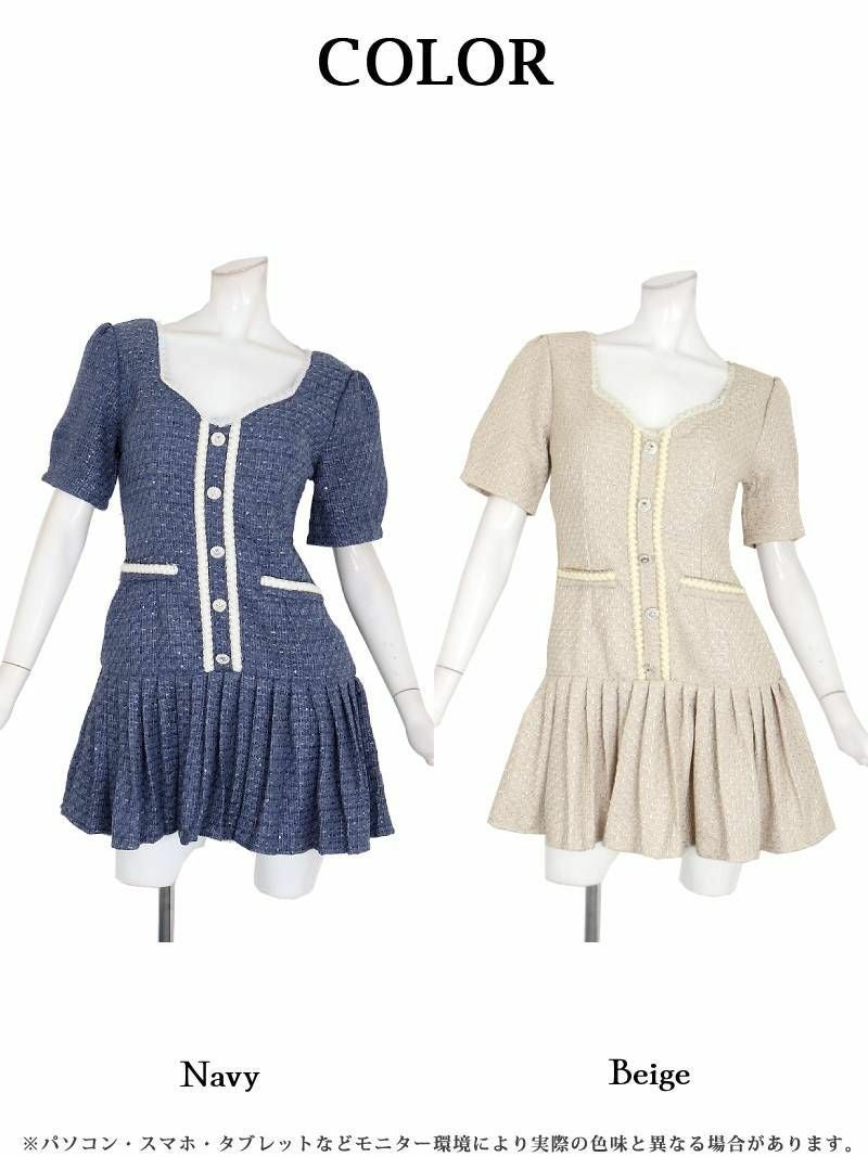 清楚で韓国デザインが一気に旬顔! ラメツイードプリーツ韓国風袖付きワンピース【Ryuyu】(S/M/L)(ネイビー/ベージュ)