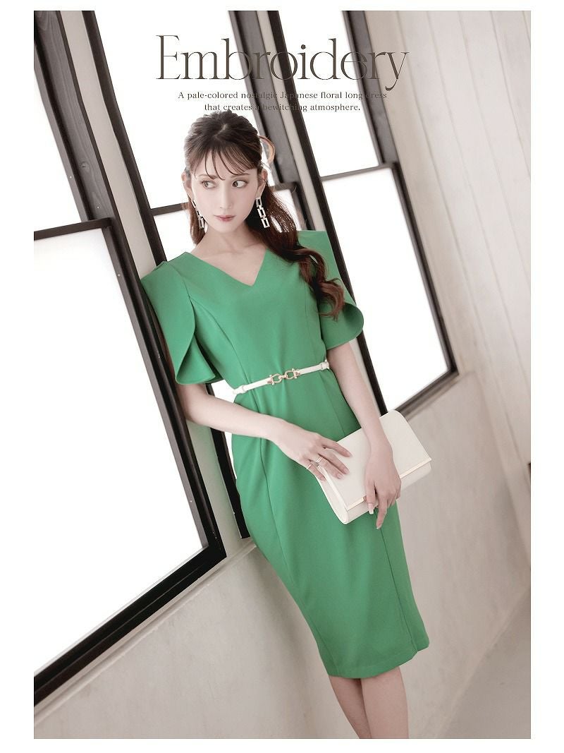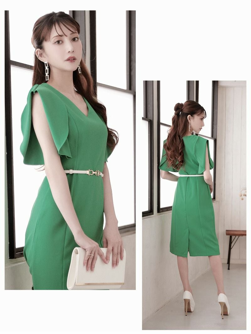 主役級の存在感を演出できる大人なキャバクラワンピース フリルスリーブグリーンセレブミディ丈キャバドレス 加賀美早紀 着用 キャバワンピース【Belsia】(S/M/L/XL(2L))(グリーン) ptpl