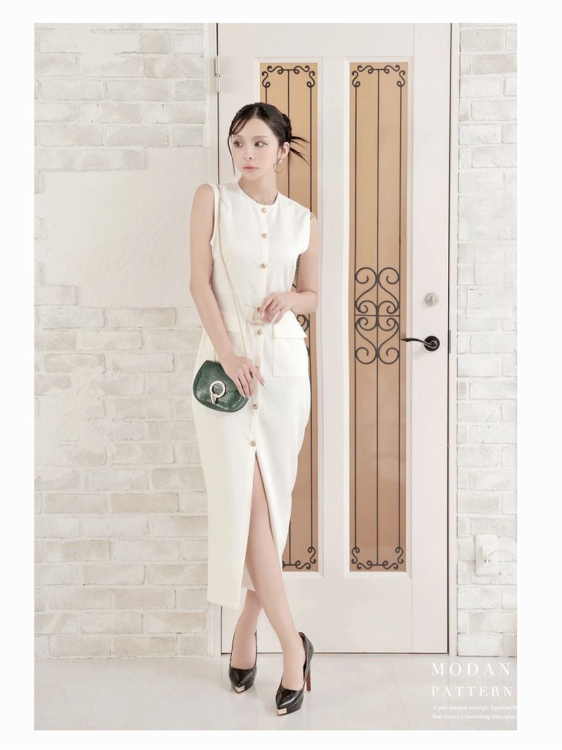 ゴールドのボタンがアクセントになった、ノースリーブの韓国タイトキャバワンピース!