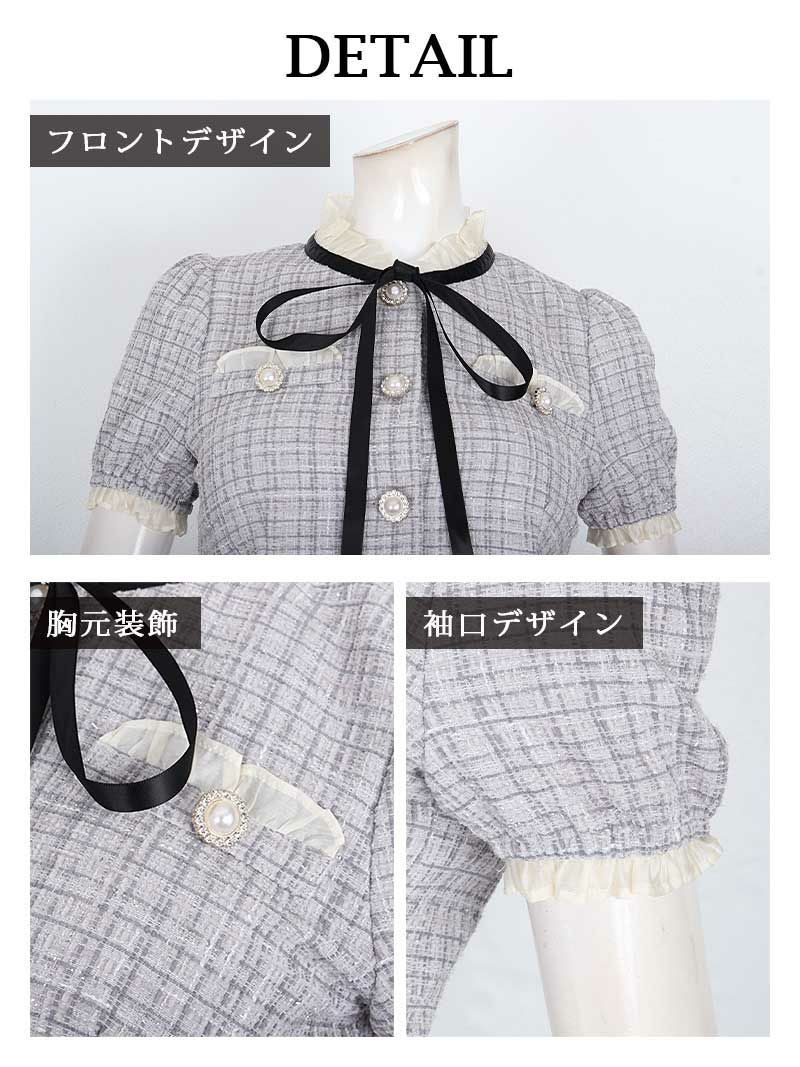 キュンキュンおリボン ライトツイードが可愛い愛されcuteキャバ嬢ミニセットアップドレス【Ryuyu】(S/M/L)(アイボリー/グレー)