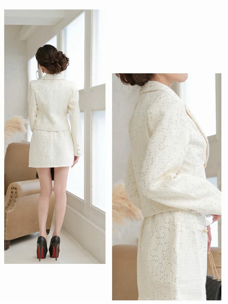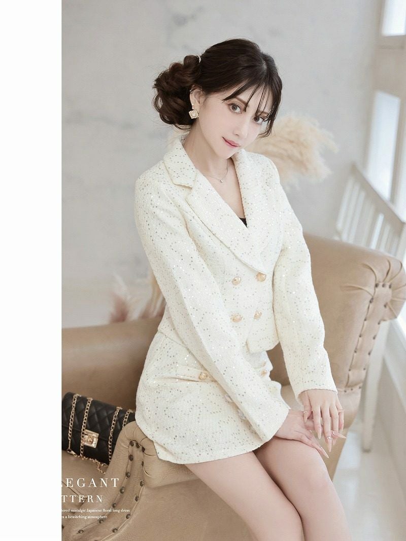 4. スパンコールツイード金ボタンセットアップスーツ 加賀美早紀 着用キャバドレス【Belsia】(S/M/L/XL(2L)/XXL(3L))(オフホワイト)