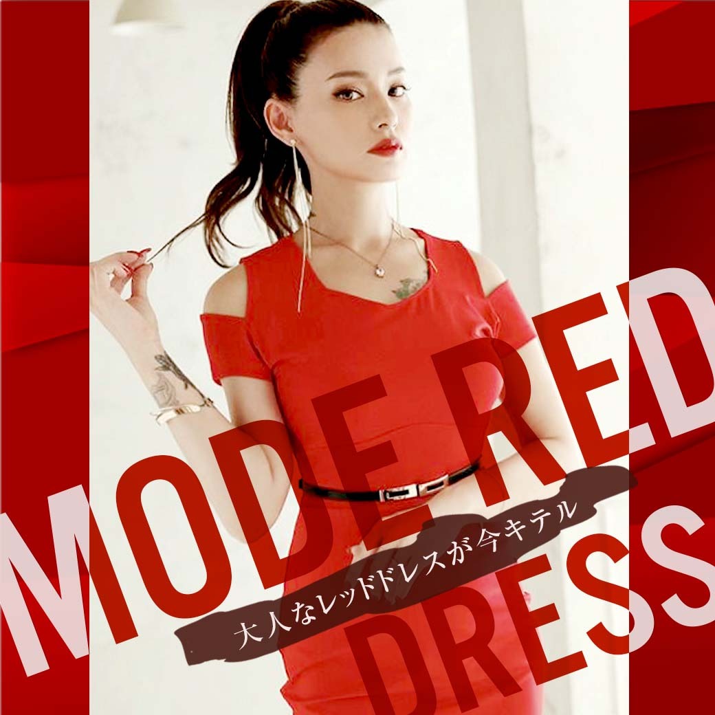 鮮やかなレッドカラーのドレスも露出が少ない分品よくみせてくれるセレブワンピ。