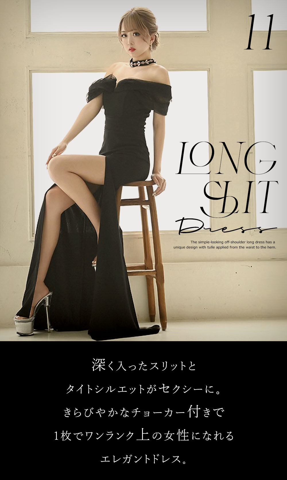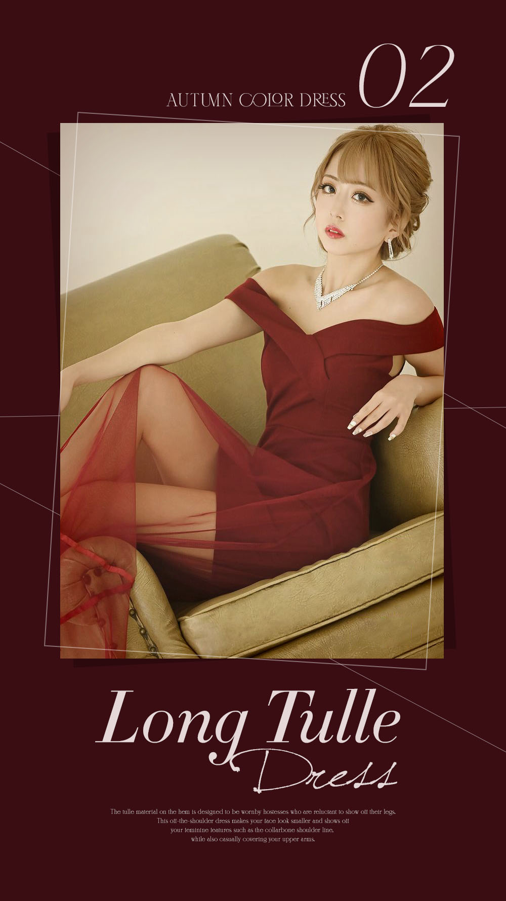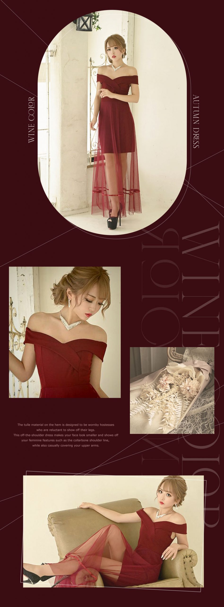 ワインカラーのチュールからの肌見せが大人の色気をONできるロングドレス。オフショルドレスだから小顔効果と鎖骨肩ラインなど女性らしい部分を存分に魅せつつロングドレスならではのゴージャス感が周りと差をつけれるワンランク上を目指すキャバ嬢さんにぴったりなキャバドレスです♪