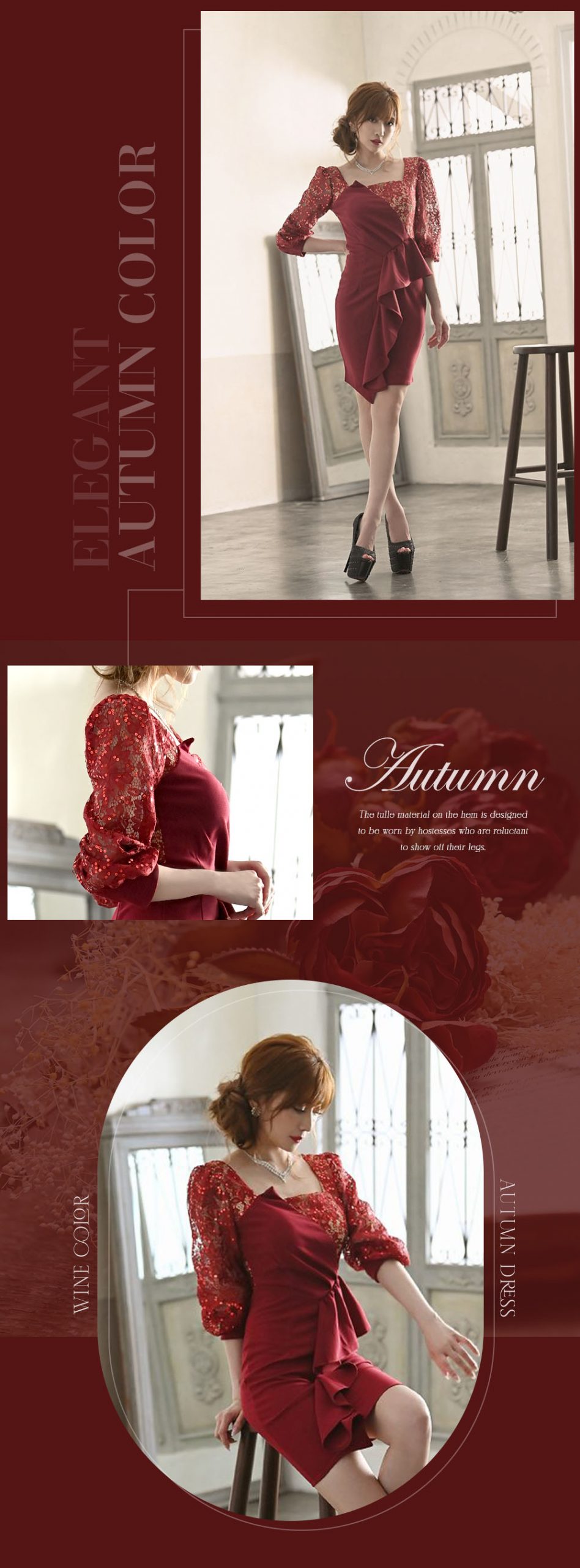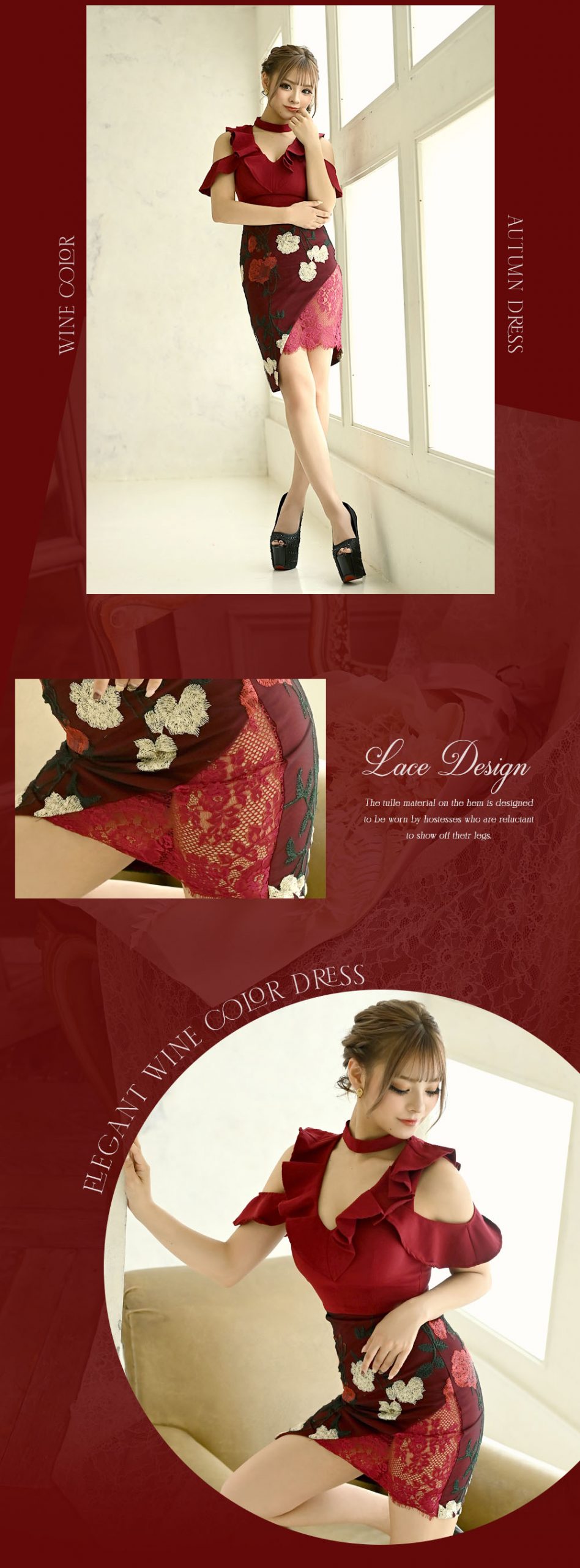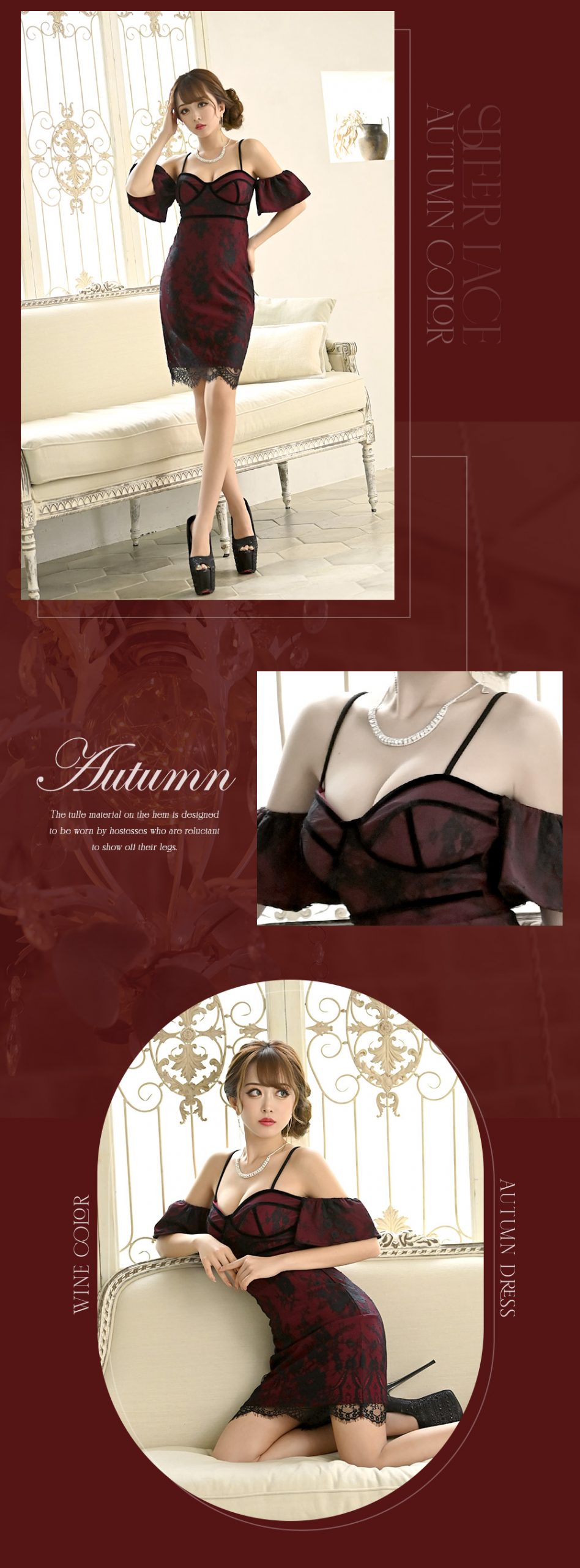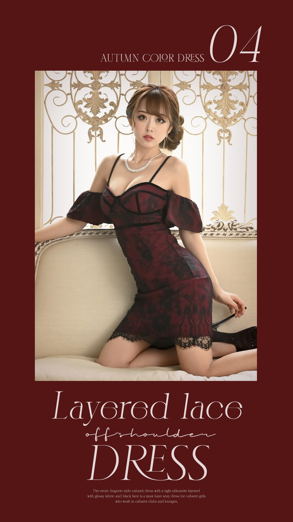 秋にぴったりなワインカラー✕ブラックの色使いのSEXYランジェリードレス。ワインカラーに抵抗がある方も、ブラックレースが全体に施されてることで妖艶な色気と美しさをアピールできる大人の色気漂うキャバクラドレスです。