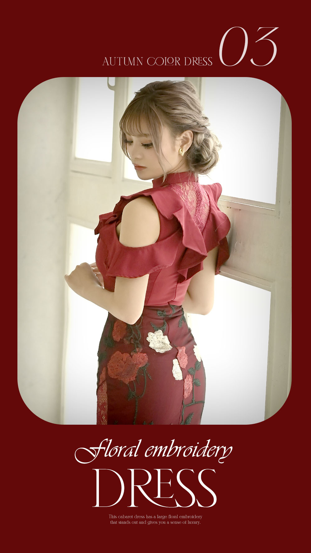 華やかなワインカラーに大柄な花刺繍が目を惹く高級感あふれるミニドレス。足元のシアーから見える素足がえちえちでお客様の目線を釘付けできちゃう♥さらに、胸元のフリルがバストにボリュームをもたせてくれるので小胸さんキャバ嬢さんも嬉しい上品で体型カバーも叶えてくれるキャバ嬢さんのための優秀ドレスです!