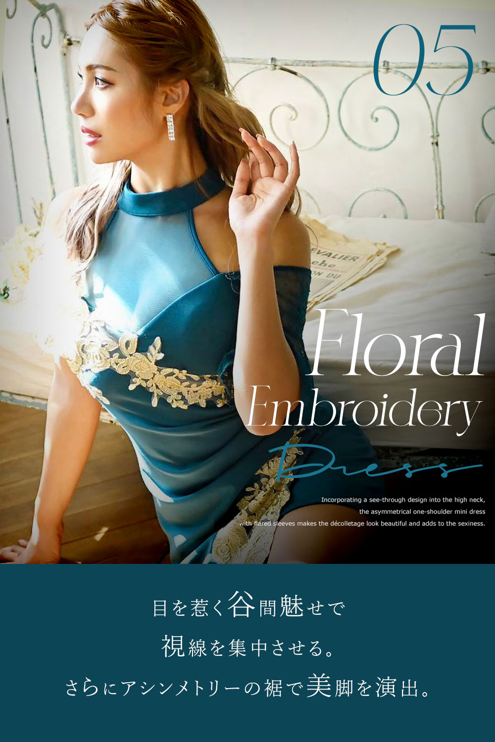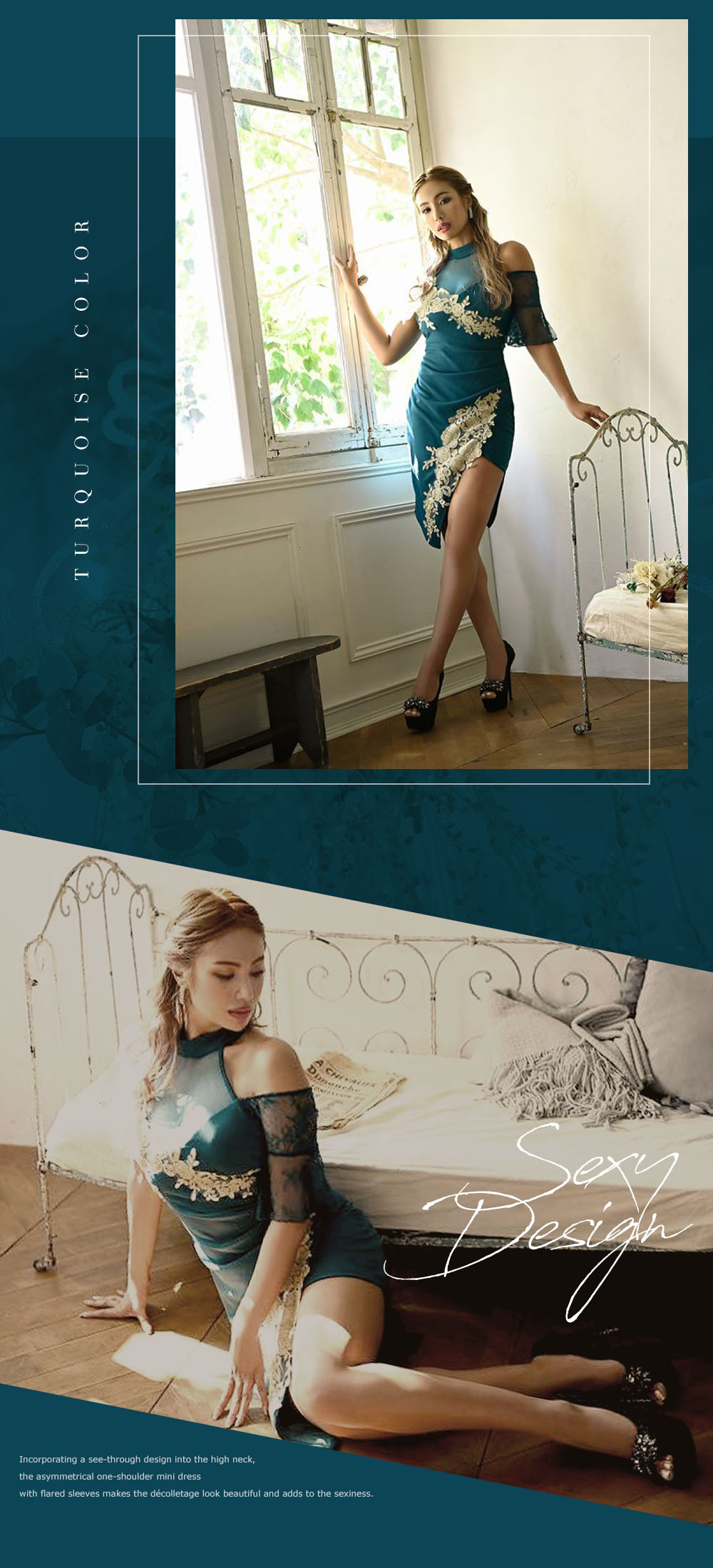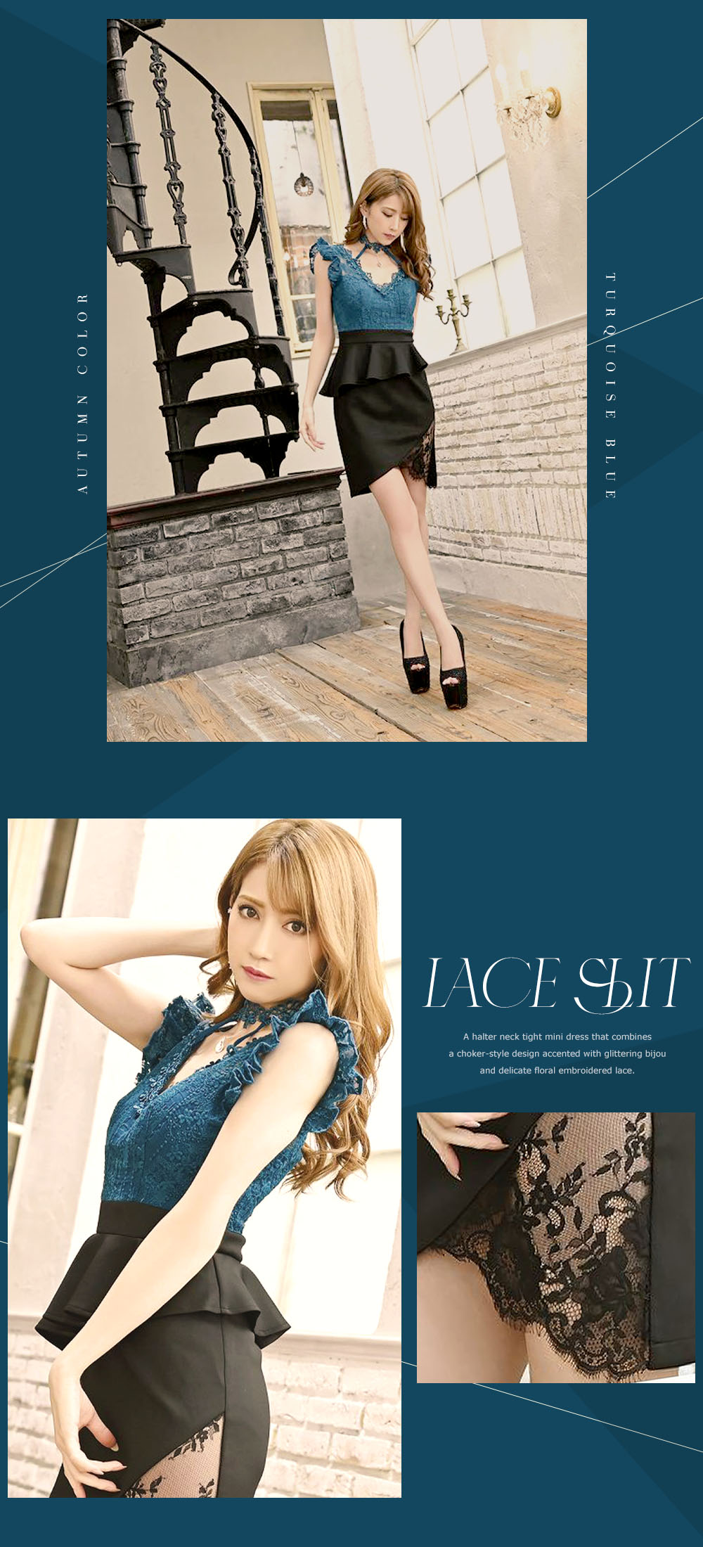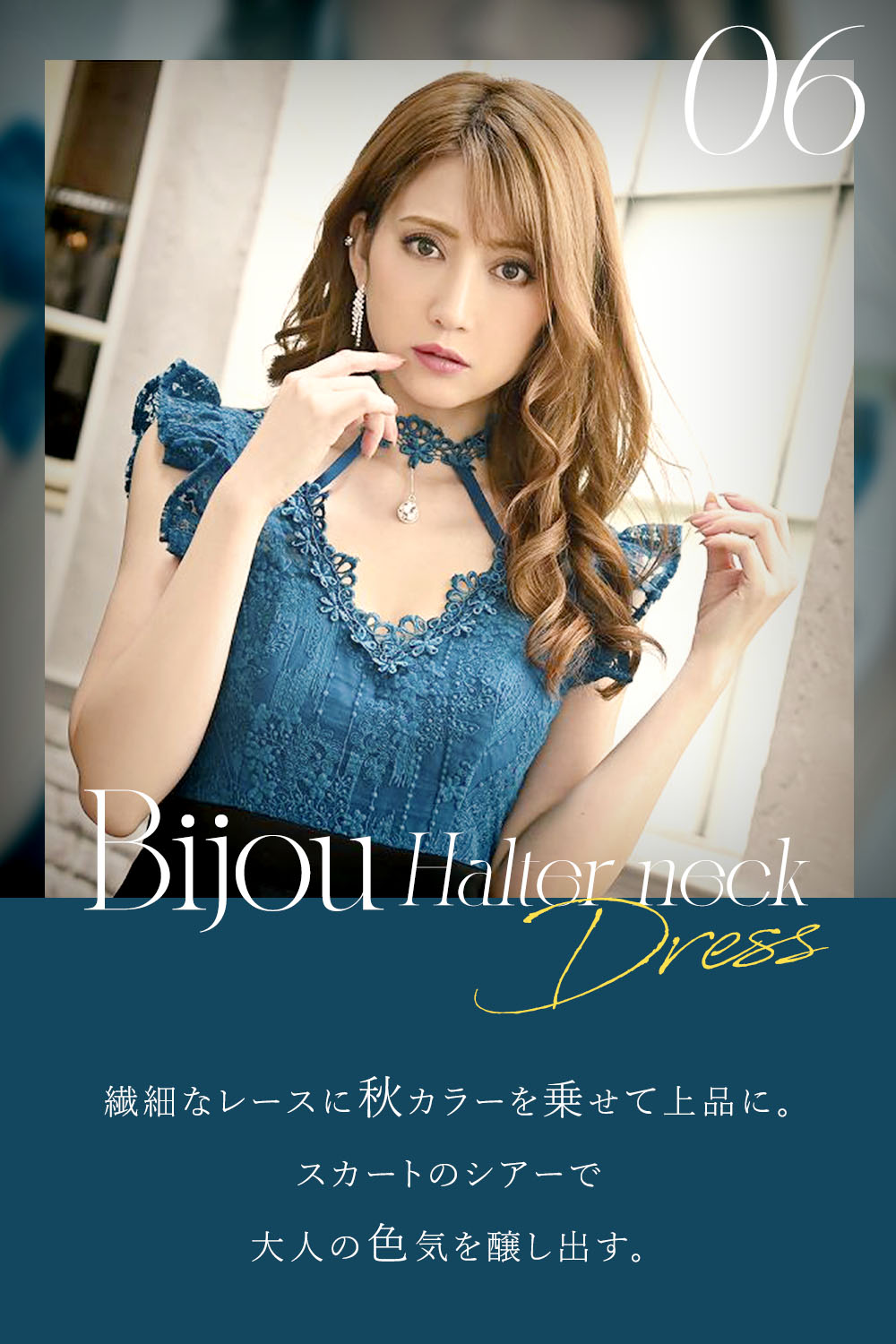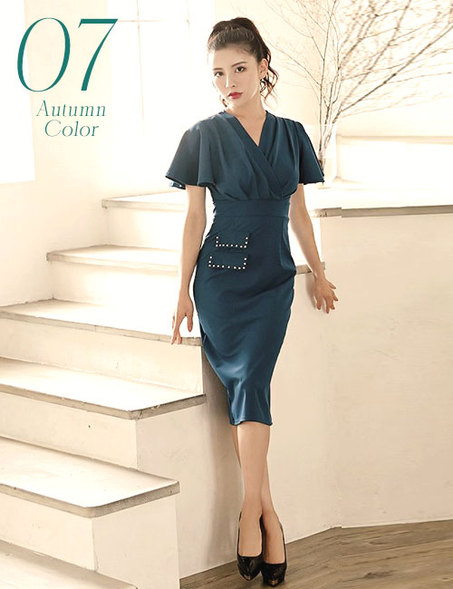 知的で落ち着いた印象になる「ターコイズブルー」のドレス。