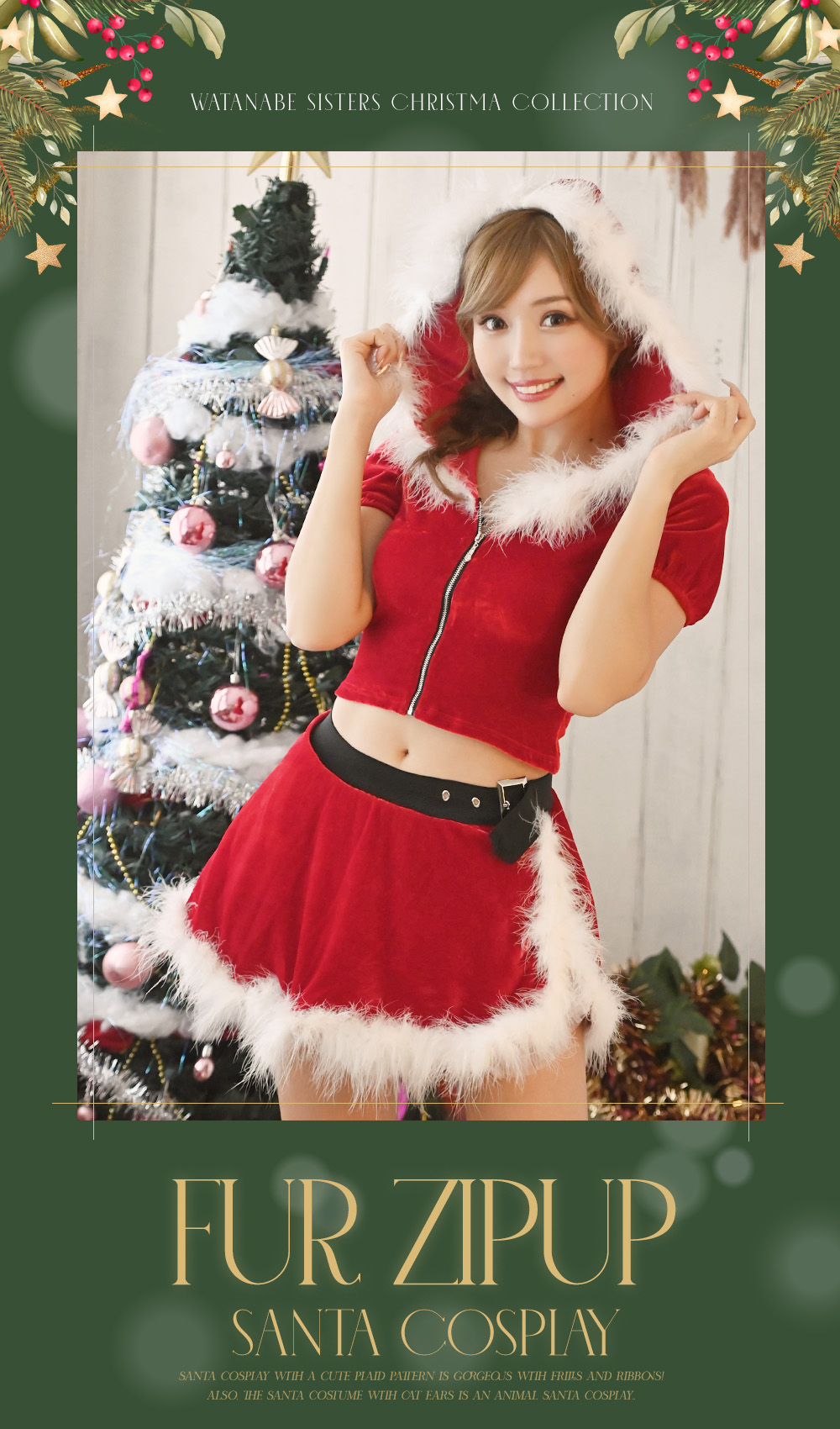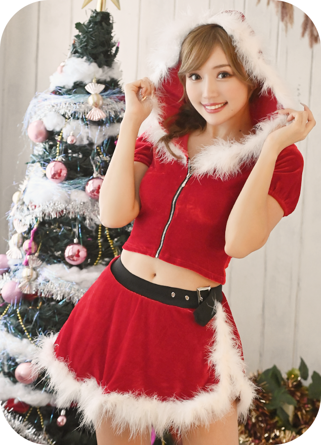 大きめのフードを被ってあざとくアピール!短めトップスとミニスカートのへそ出しサンタコスはエロさと甘さをいいバランスでMIXしたよ♡スタイルが良く魅せれるところもオススメ♡
