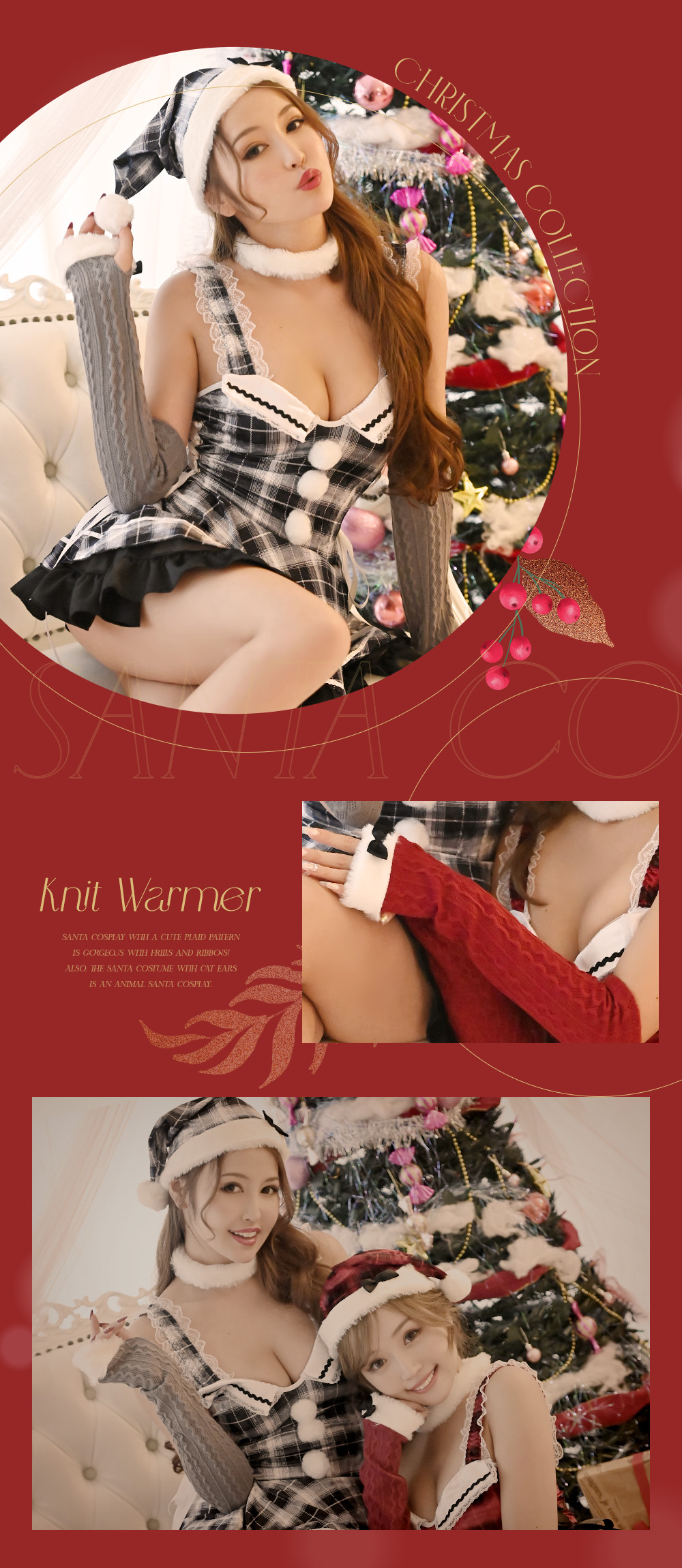 トレンドのアームウォーマーを取り入れたサンタコスプレ♡冬らしいニットアームウォーマーと温かみのあるチェック柄がガーリーさを引き立たせる♡お揃いで着たらさらに可愛い♡
