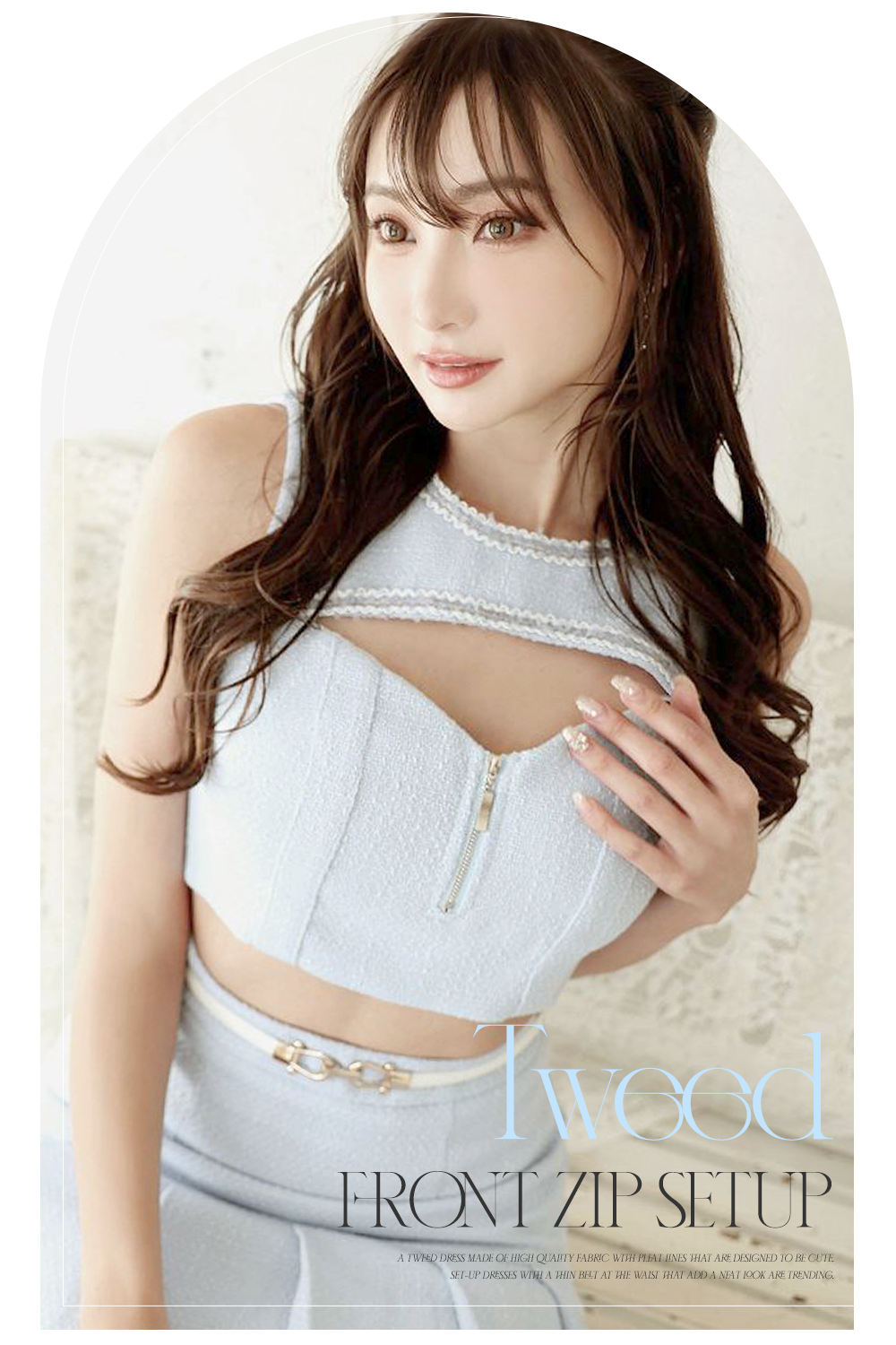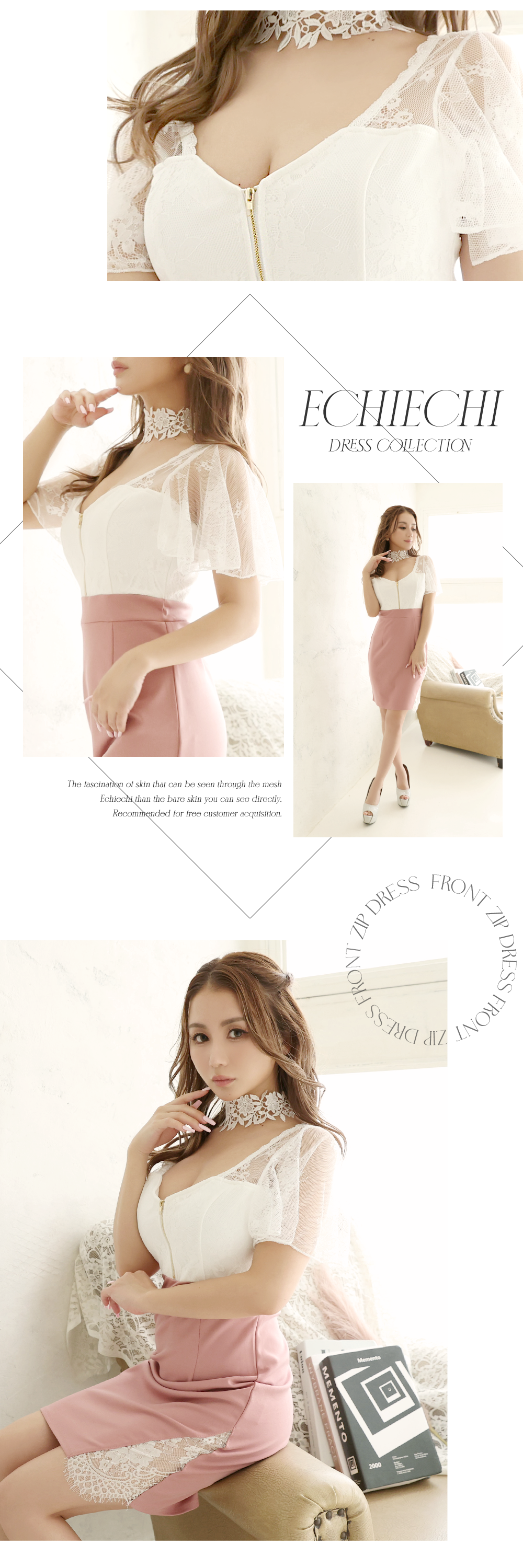 ホワイトを基調としたえちえちドレスはダスティカラーを合わせて清楚に♡でも清楚だけじゃない、フロントジップのエロさであざとかわいい女子に仕上げてくれる♡