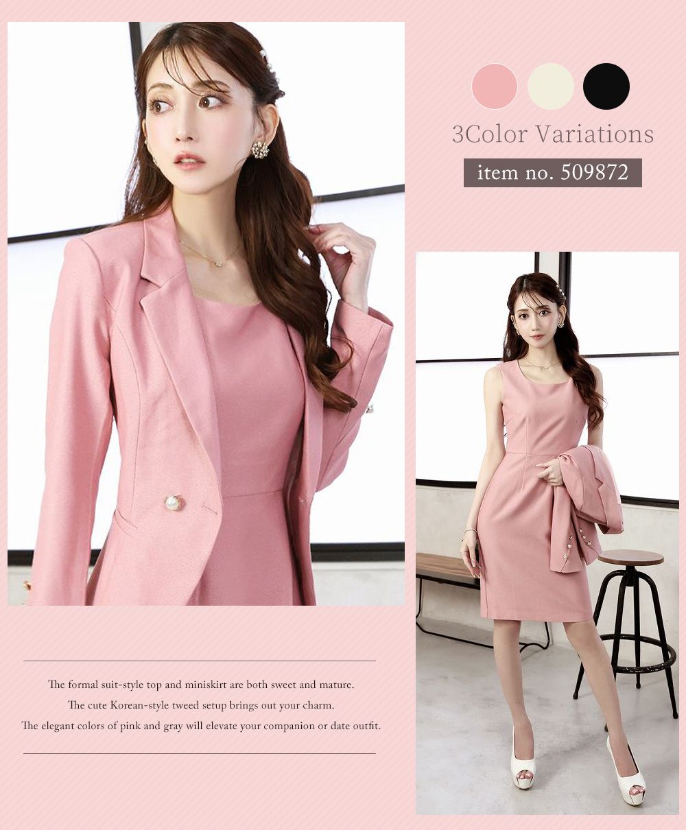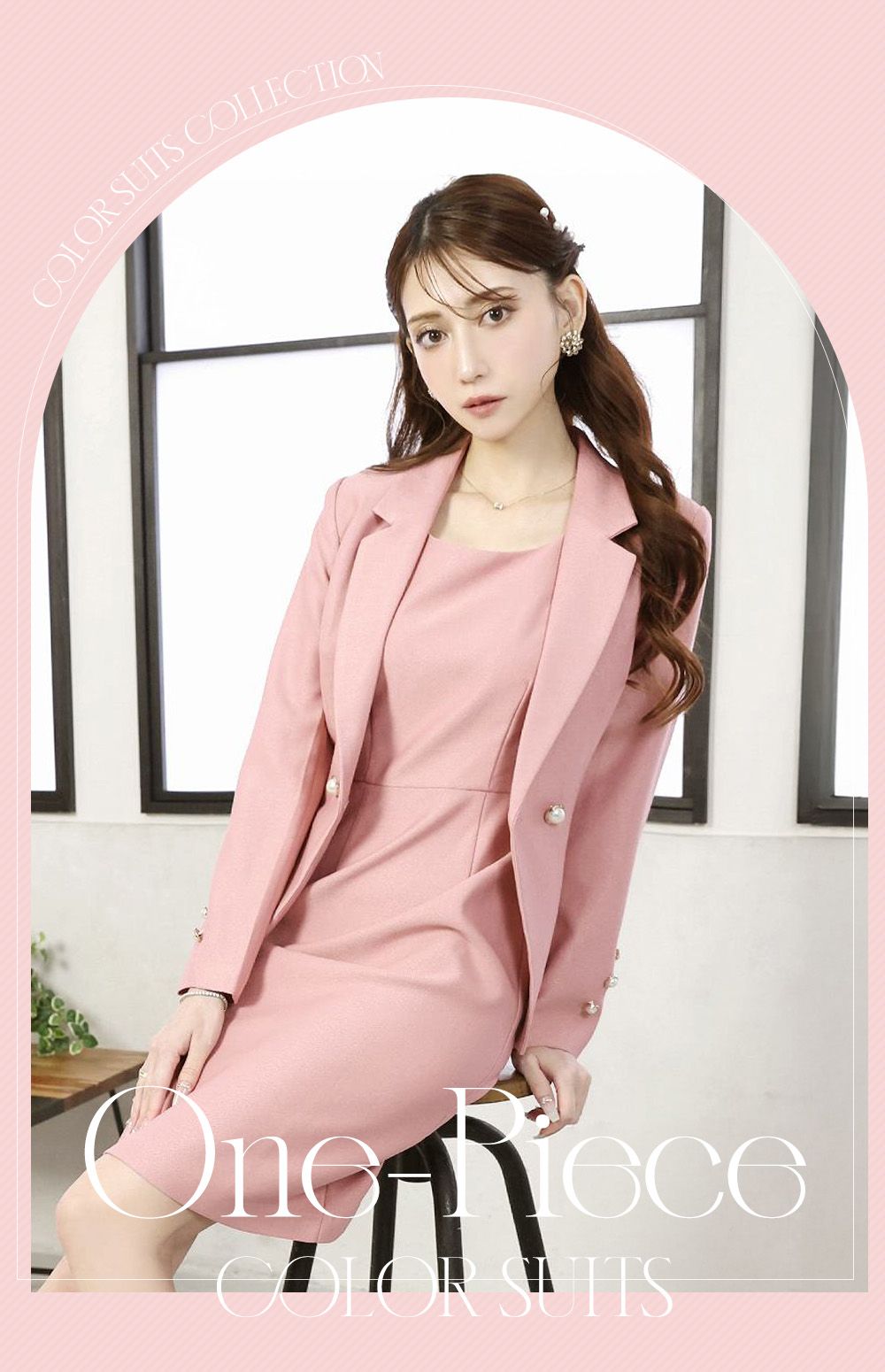 フェミニンな魅力を引き立てる優しいピンクのカラーワンピスーツ♥女性らしさを引き立て、品格と可愛らしさを両立。