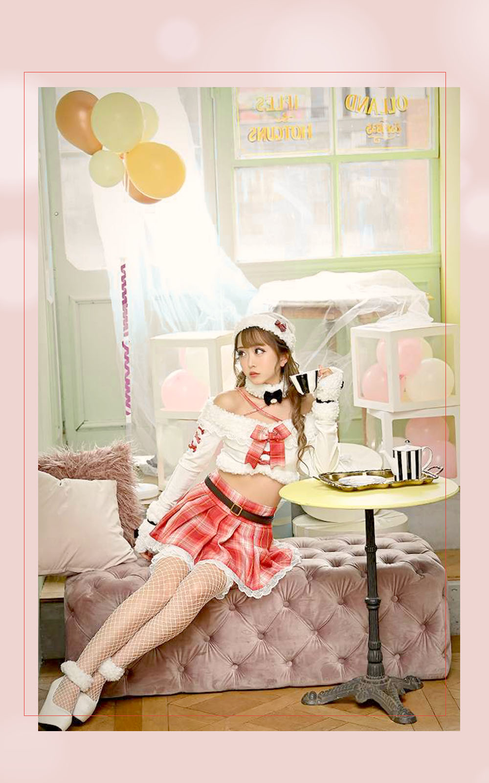 ギンガムチェック柄とハードめなベルトを合わせてちょっぴり小悪魔チックに攻めたサンタコスプレ!ミニスカートから見える美脚にお客様もドキドキしちゃう♡