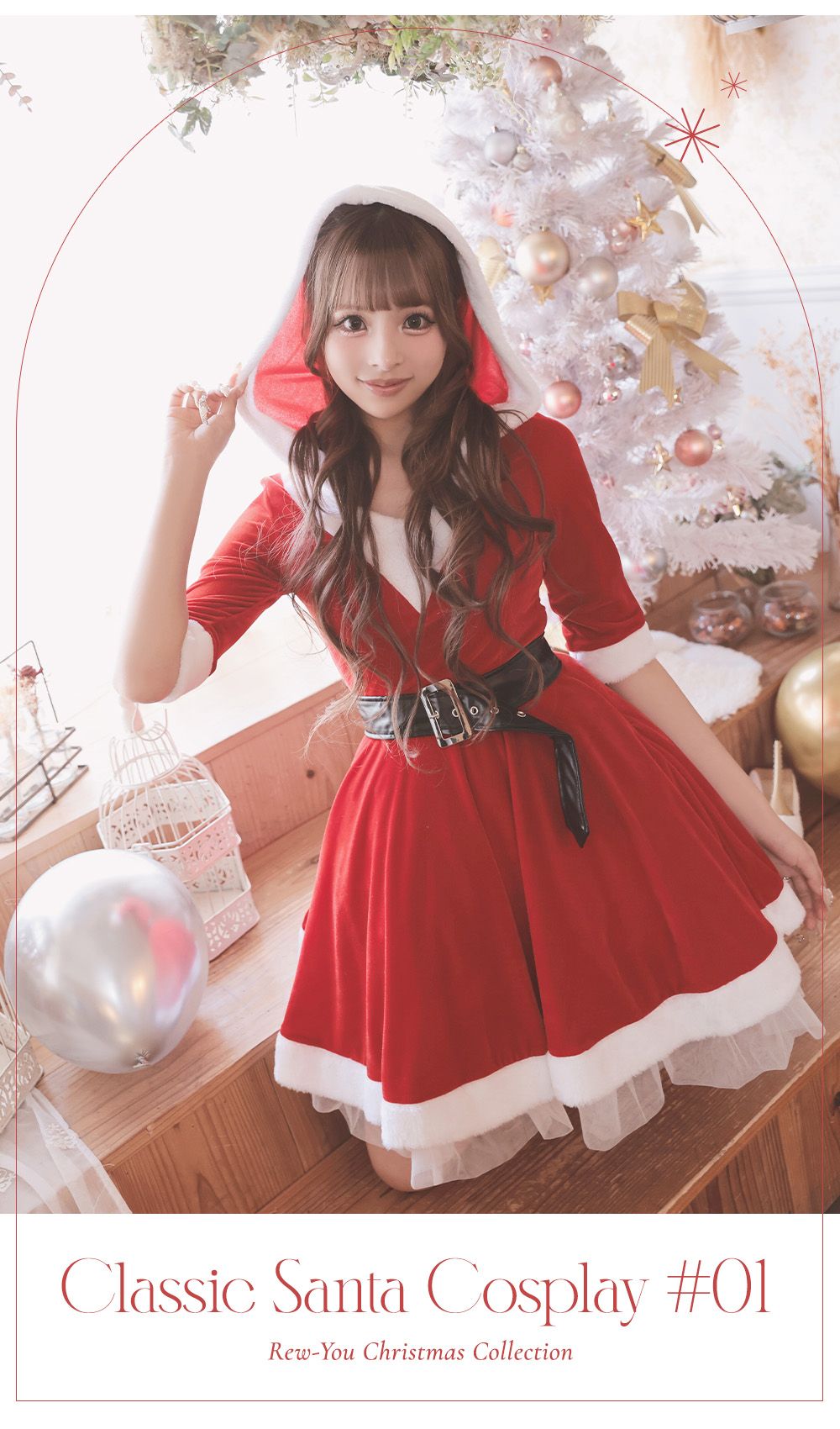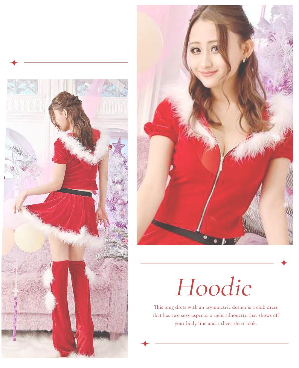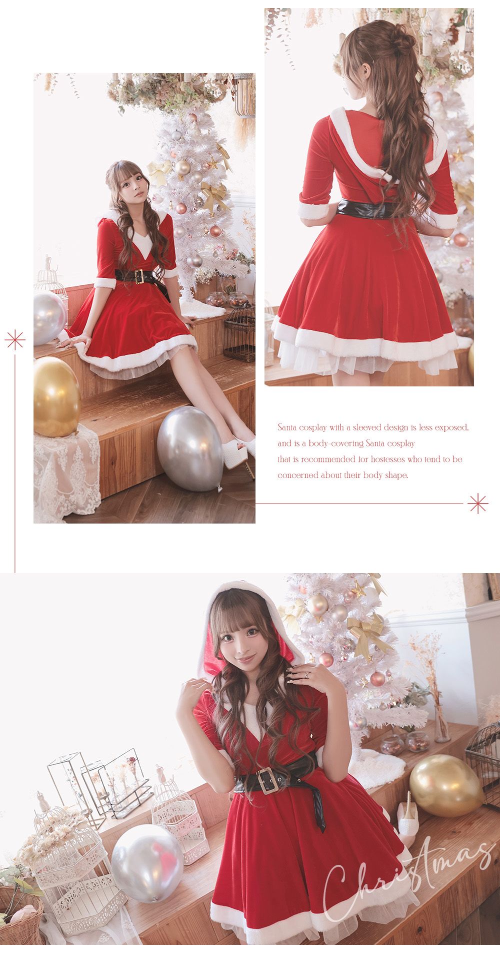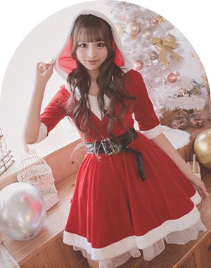 ふんわりシルエットが可愛い王道サンタコスプレはフード付きでスタイルアップも叶える♡袖付きで露出度も低めなのも嬉しいポイント♡