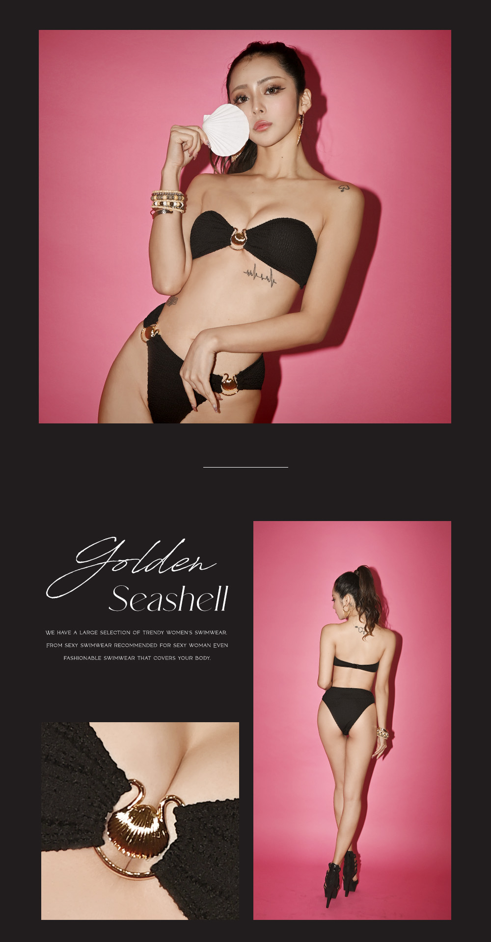ゴールドシェルがアクセントに♡ブラックのワンカラーだからこそエキゾチックに色気を演出♥バンドゥ水着でバストもしっかり盛って♡