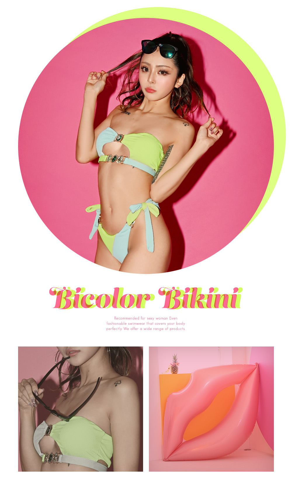 派手なバイカラーの配色とビジューが可愛すぎる♥友達とお揃いで着用してさらに映え度UPするバンドゥビキニは溢れるゴージャスな雰囲気がたまらない・・♡ギャルらしくとことん派手にキメたギャル水着は必見♡