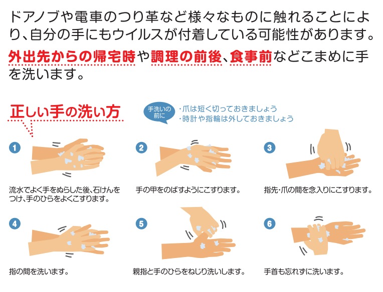 - 手洗いはしっかり、こまめに。アルコール除菌手洗いか、石鹸手洗いなら最低15秒。