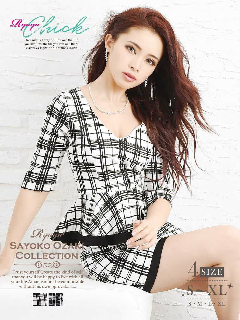 モノトーンチェック柄五分袖キャバクラドレス