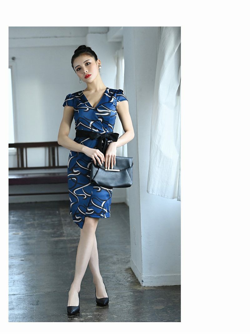 カシュクール袖付きチェーン柄風膝丈ミニドレス